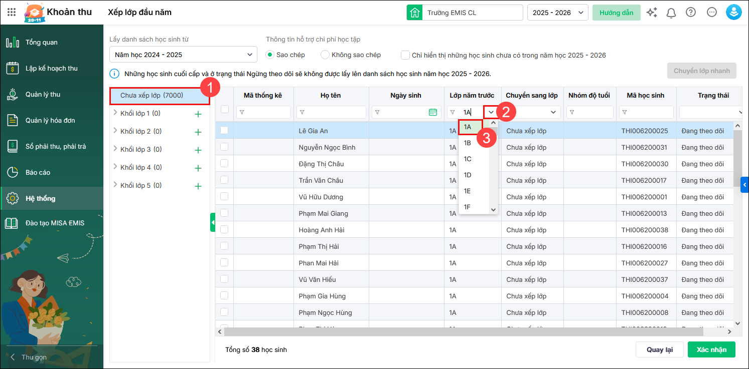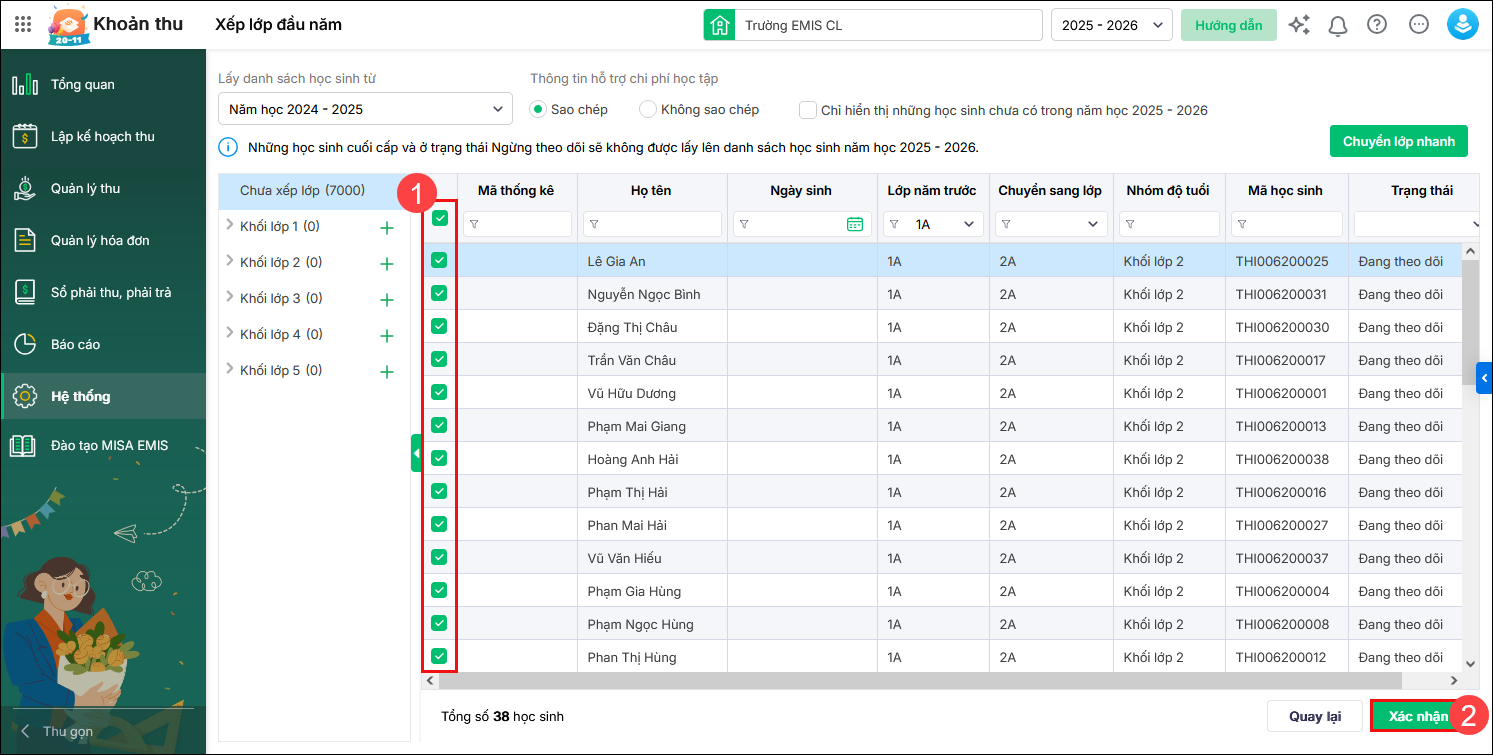 Bước 6: Tích chọn những học sinh đã chọn Lớp trong năm học mới, nhấn Xác nhận.