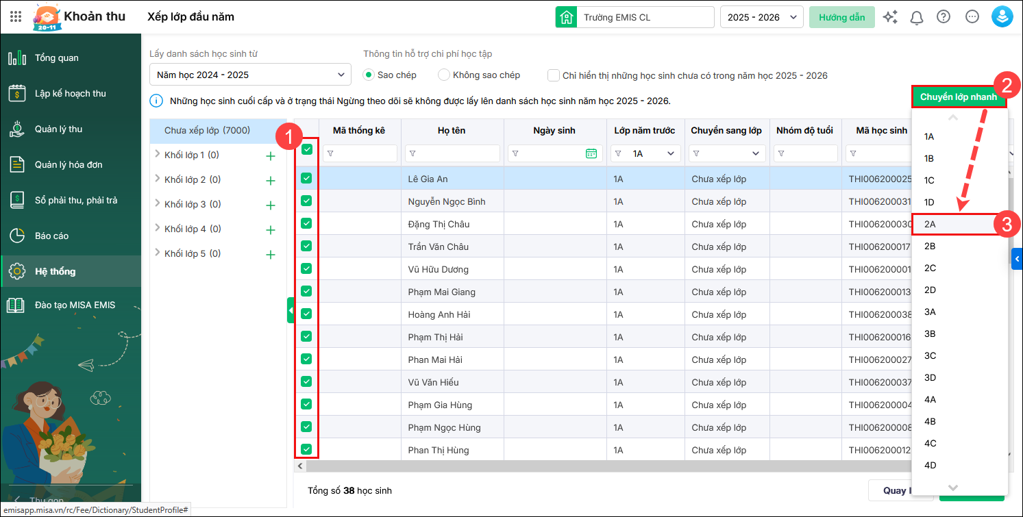 Nhấn Chuyển lớp nhanh, chọn Lớp trong năm học mới. (Ví dụ: Học sinh từ lớp 1A trong năm học cũ chuyển lên lớp 2A trong năm học mới)