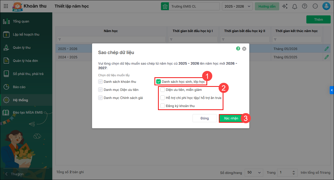 Tùy chọn tích Diện ưu tiên, miễn giảm; Hỗ trợ chi phí học tập/hỗ trợ ăn trưa; Đăng ký khoản thu để sao chép dữ liệu hay không. Nhấn Xác nhận.