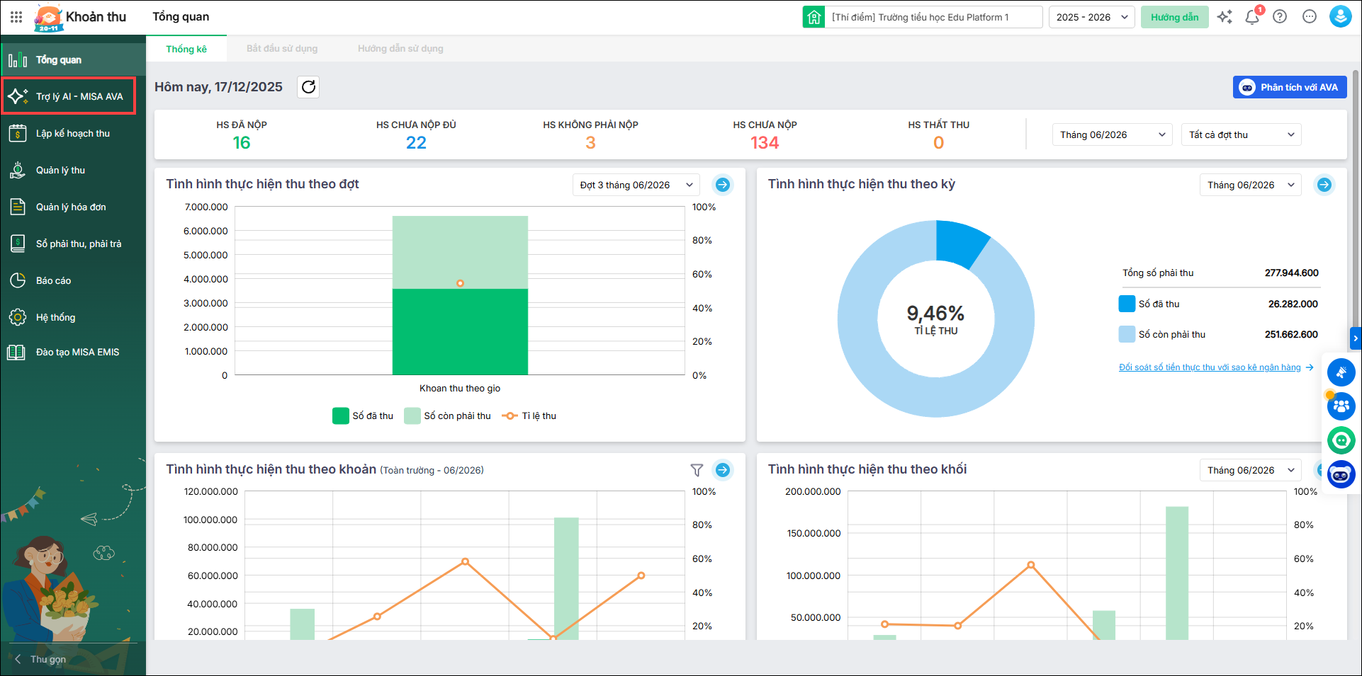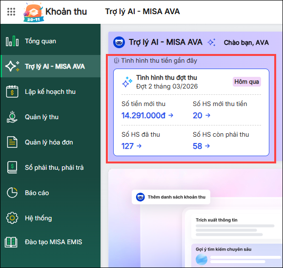 - Đăng nhập vào EMIS Khoản thu, chọn Trợ số AI – MISA AVA