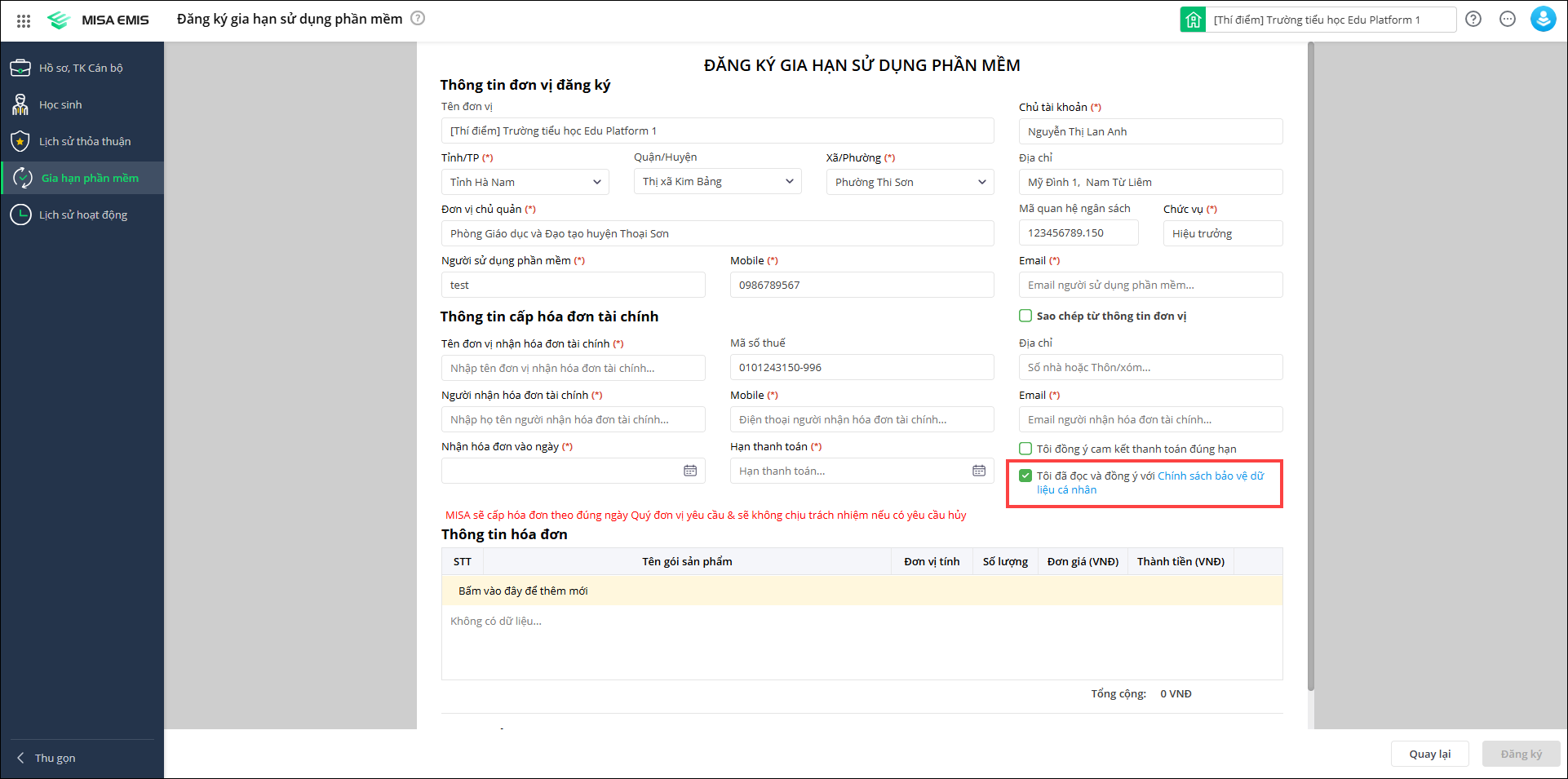 - Tại màn hình Đăng ký gia hạn sử dụng phần mềm, bổ sung thêm ô Tôi đã đọc và đồng ý với Chính sách bảo vệ dữ liệu cá nhân.