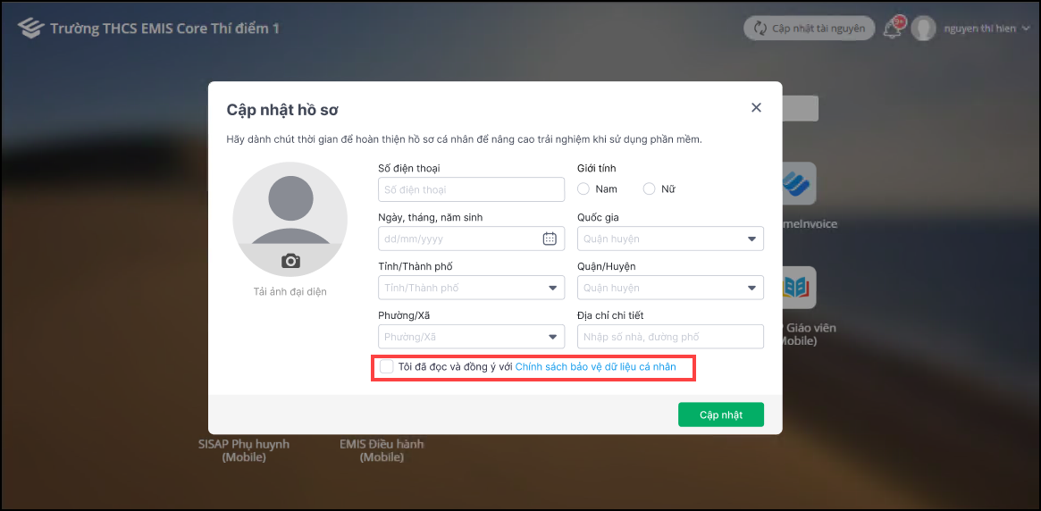 3.Tại màn hình Cập nhật hồ sơ, bổ sung ô Tôi đã đọc và đồng ý với Chính sách bảo vệ dữ liệu cá nhân.