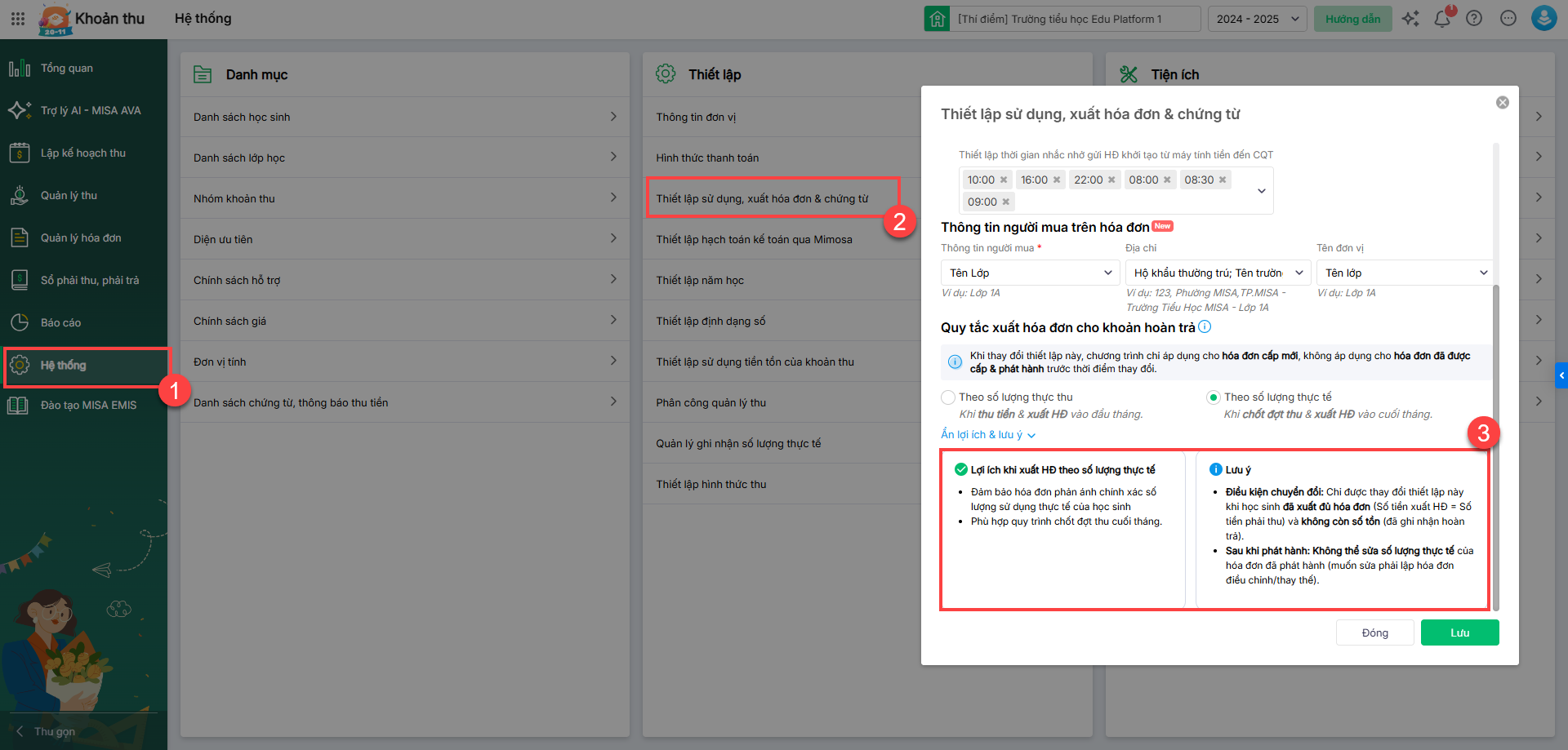 - Bổ sung các gợi ý và lợi ích chi tiết của 2 hình thức xuất hóa đơn theo số lượng thực thu và theo số thực tế