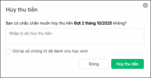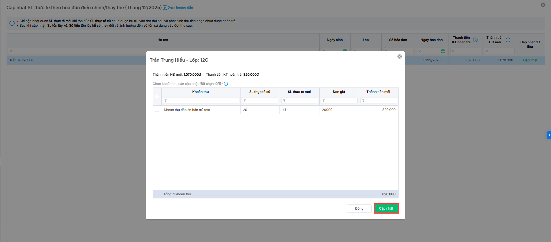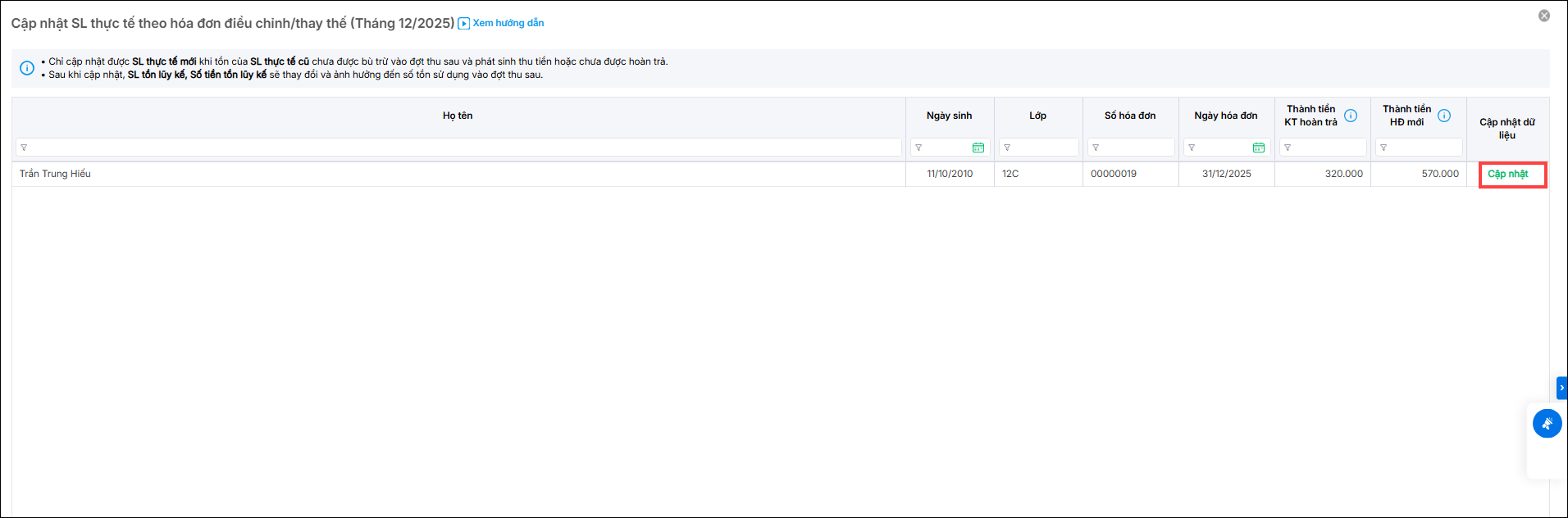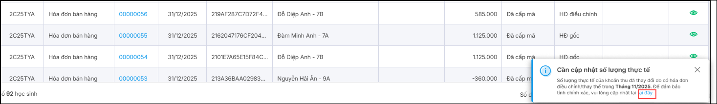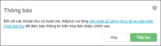 - Phần mềm hiển thị thông báo với các khoản thu hoàn trả, vui lòng cập nhật số lượng thực tế tại màn hình chốt đợt thu để đảm bảo thông tin trên hóa đơn được chính xác