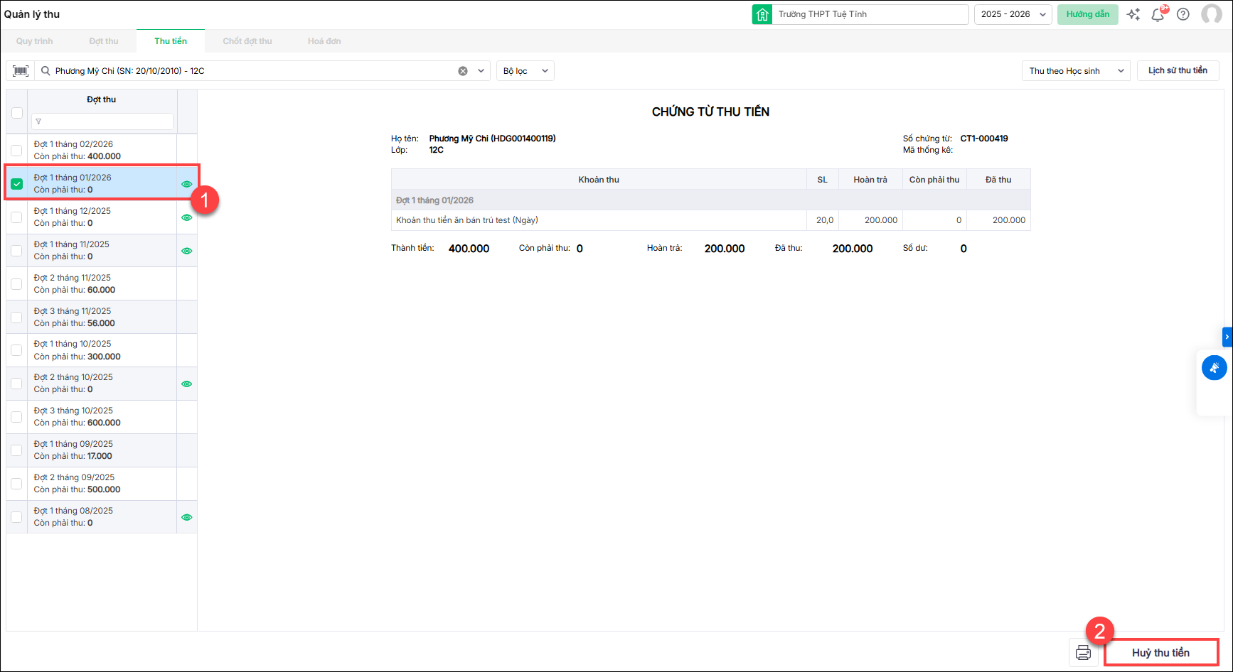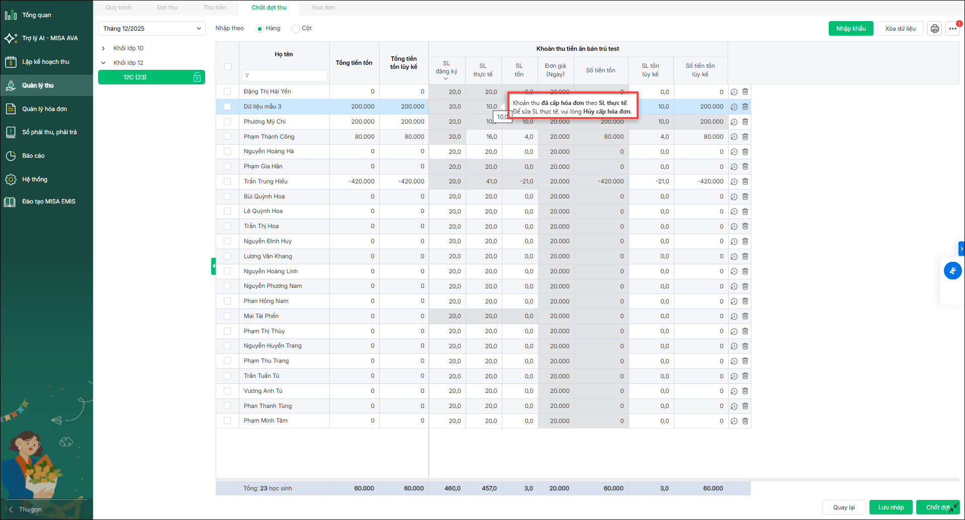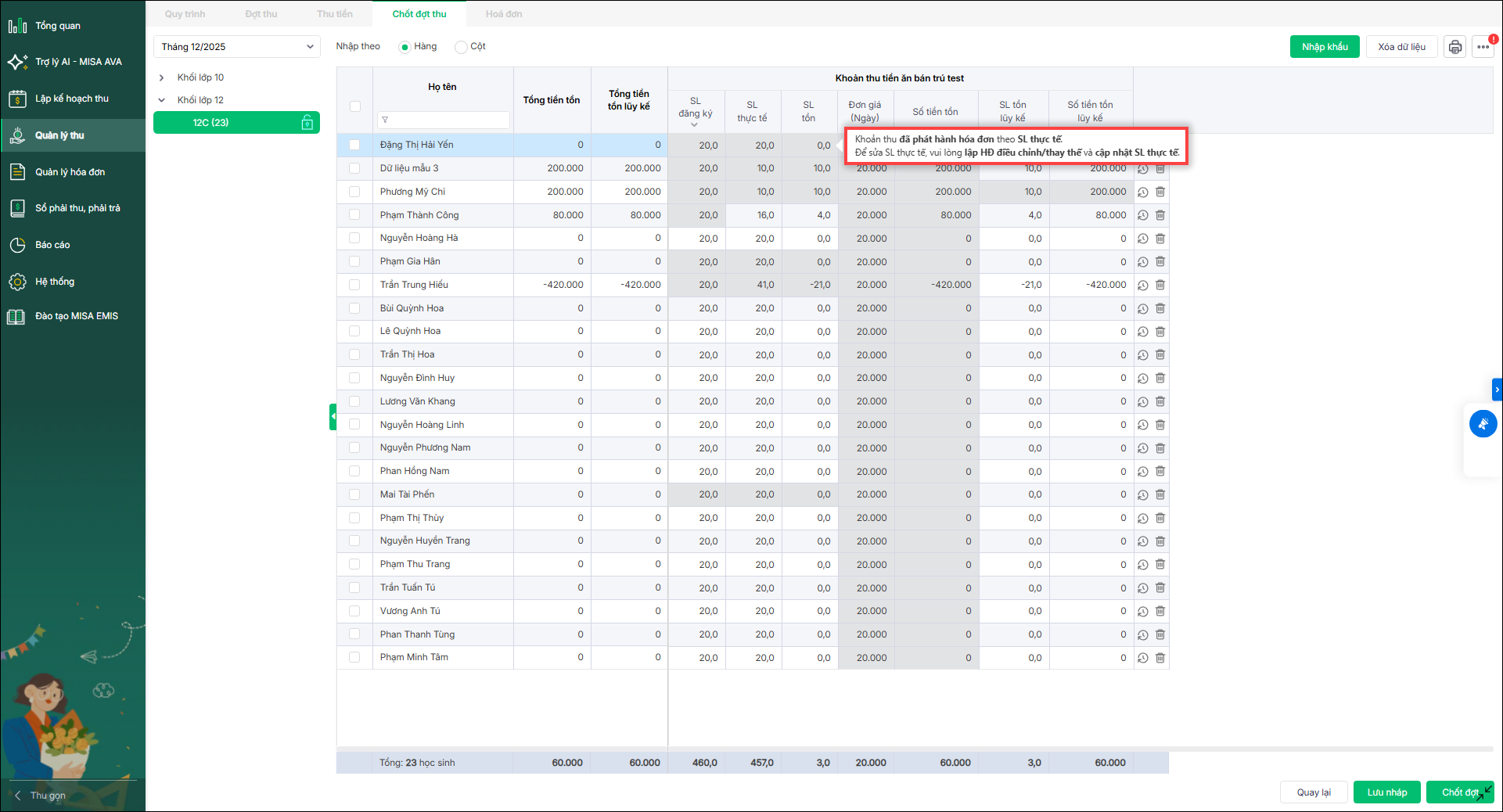 - Phần mềm hiển thị thông báo với các khoản thu hoàn trả, vui lòng cập nhật số lượng thực tế tại màn hình chốt đợt thu để đảm bảo thông tin trên hóa đơn được chính xác