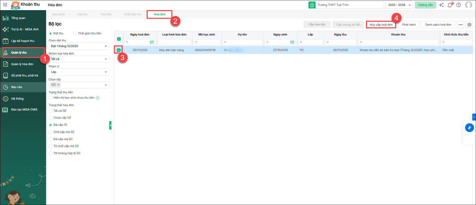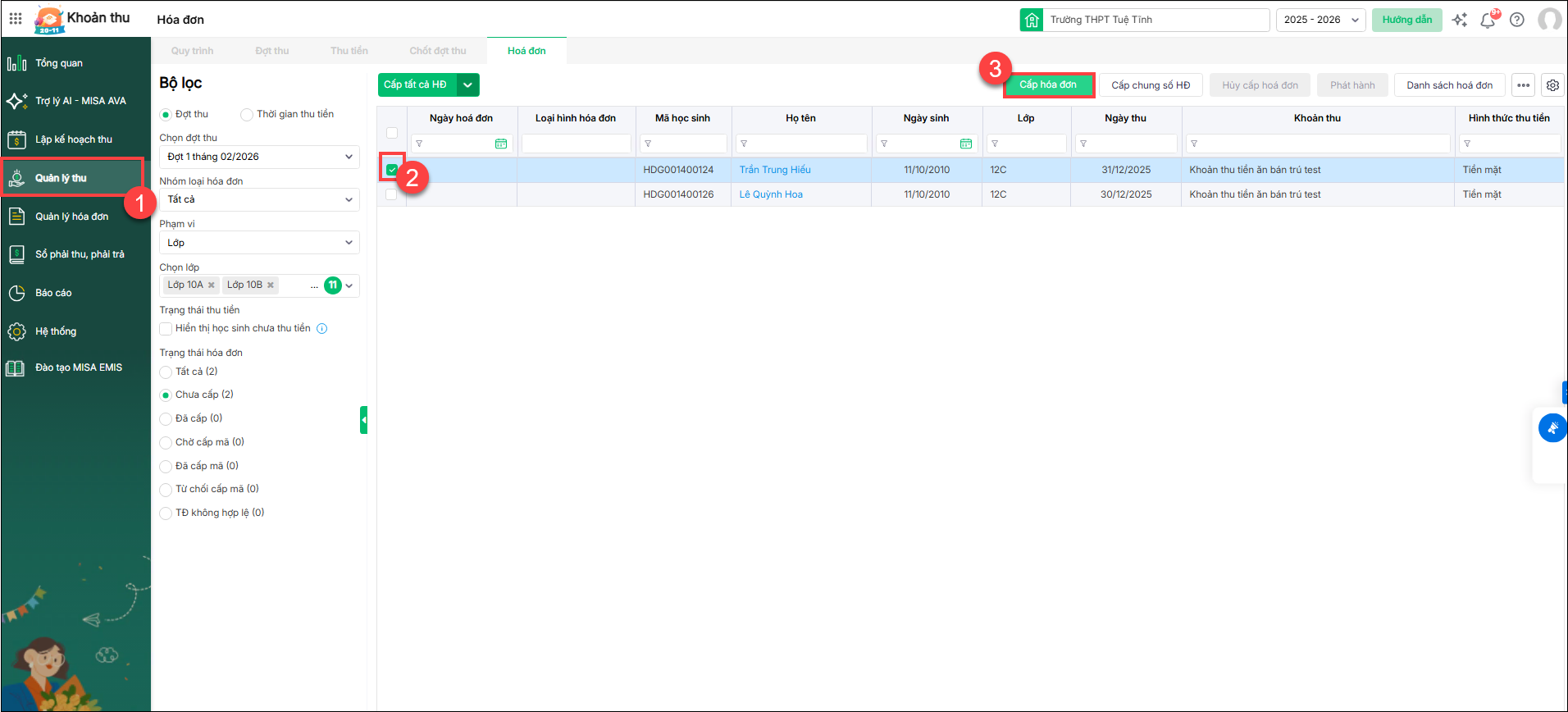 - Vào Quản lý thu/chọn mã học sinh. Nhấn Cấp hóa đơn