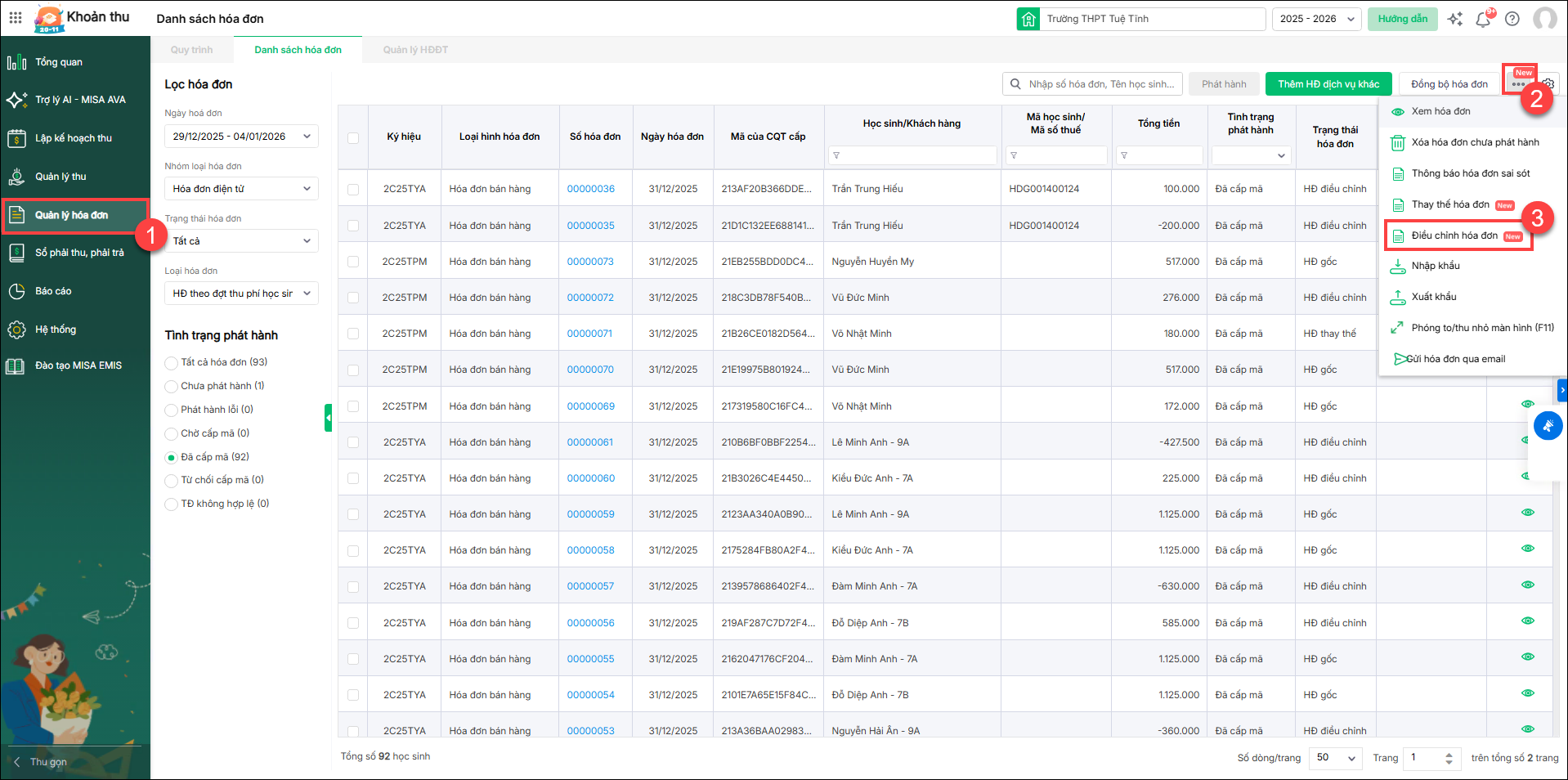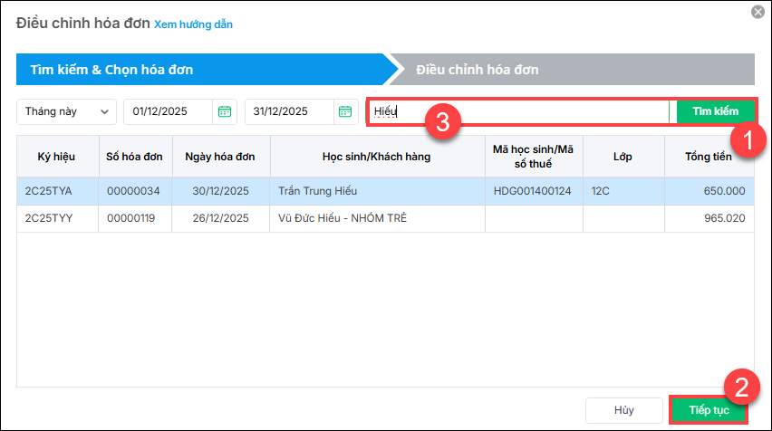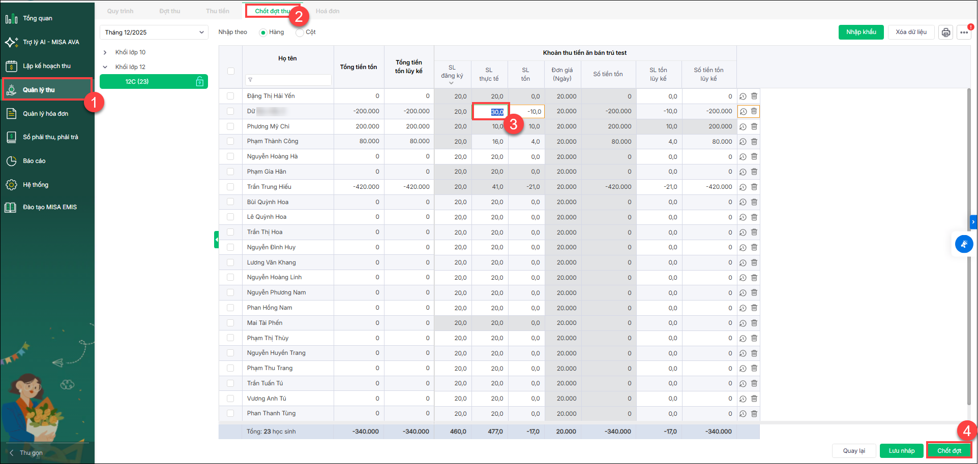VD: Học sinh A tháng 7 đăng ký và đóng đủ, cuối tháng chốt đợt thu sử dụng: 2, tồn 2. Mong muốn xuất hóa đơn theo số sử dụng thực tế của học sinh. Nếu đúng quy trình thì xuất hóa đơn sau chốt đợt thu, thì số đợt xuất hóa đơn thực tế = 2 và số tồn = 2. Nhưng vì thu tiền trước khi chốt đợt thu nên kế toán xuất hóa đơn ngay tại thời điểm đó và xuất bằng số đăng ký nên số xuất hóa đơn thực tế = 4 và cuối tháng thông tin cập nhật được số sử dụng để chốt đợt thu