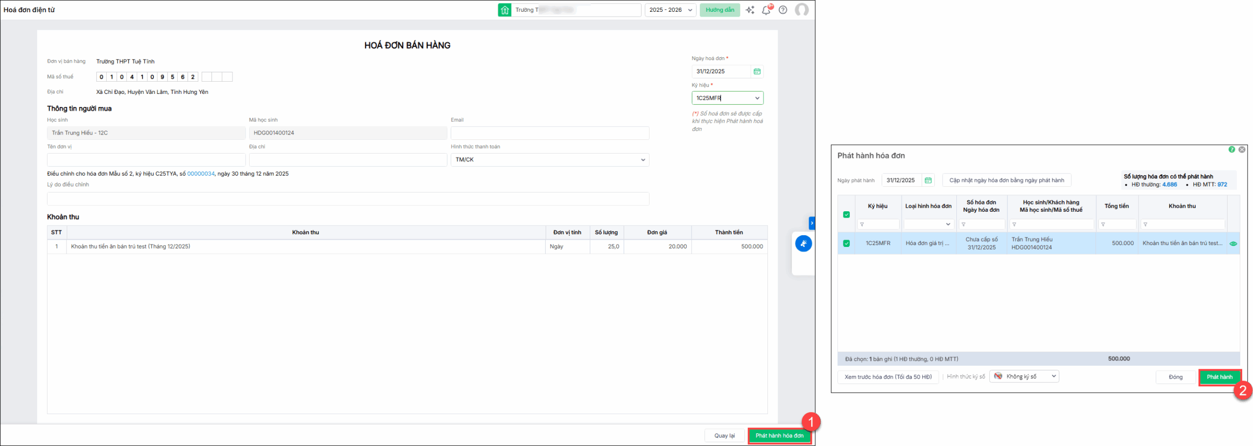 Đầu tháng, học sinh đăng ký khoản Dịch vụ tiền ăn thứ 7 và thu đủ tiền. Sau khi thực hiện thu tiền, kế toán xuất hóa đơn luôn tại thời điểm thu tiền theo quy định của cơ quan thuế