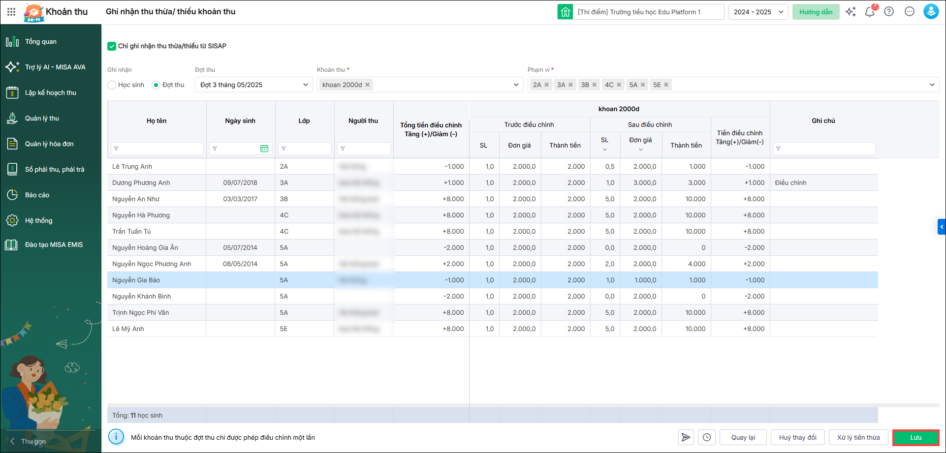 • Lưu ý: Phần mềm chỉ hỗ trợ điều chỉnh 1 lần với mỗi khoản thu thừa/thiếu trong 1 đợt thu.