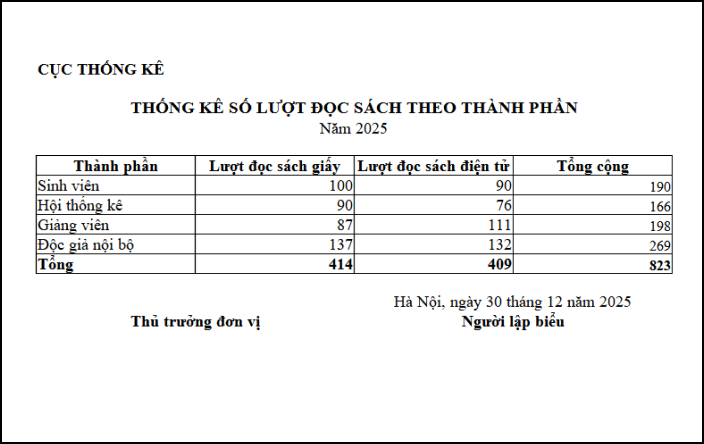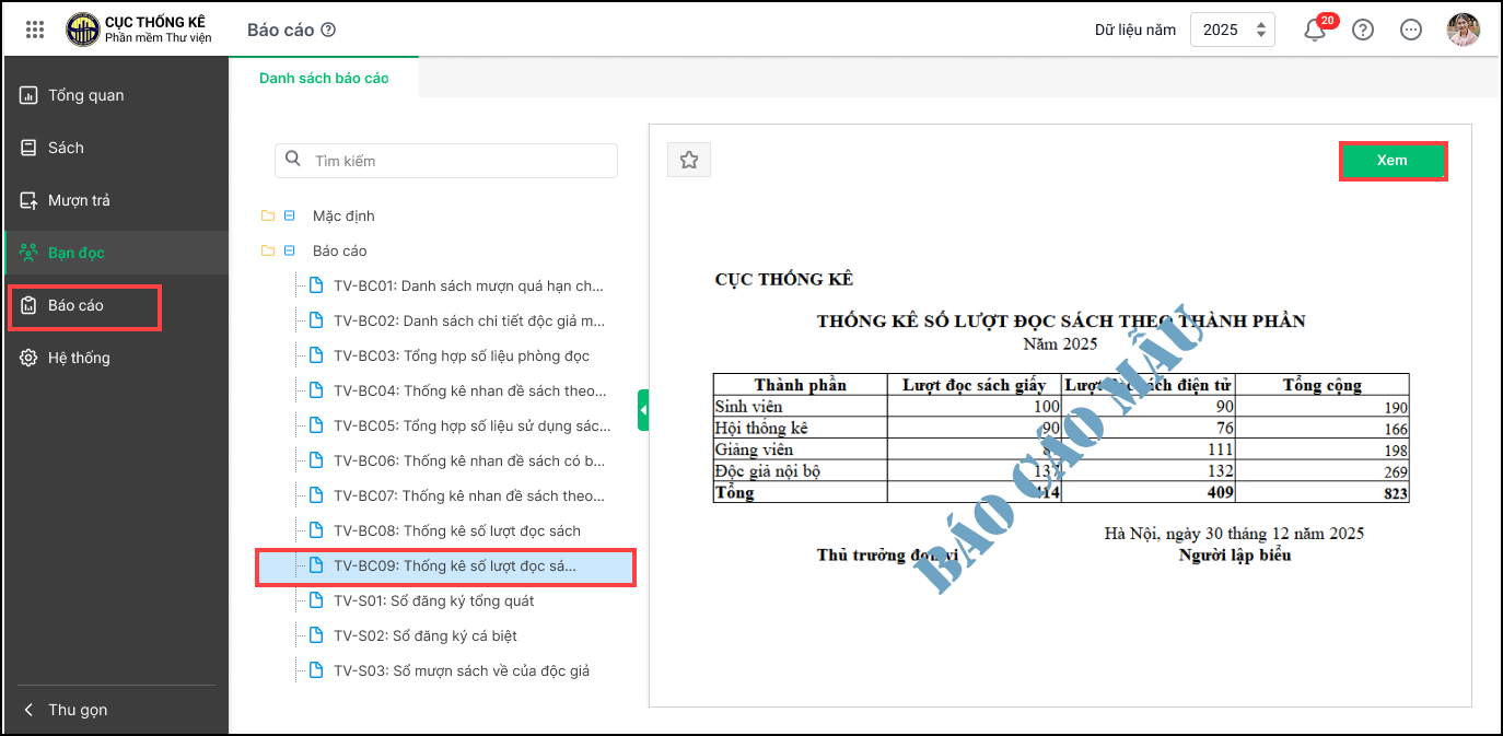 1. Chọn Báo cáo\TV-BC09: Thống kê số lượt đọc sách theo thành phần. Nhấn Xem