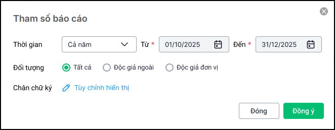 – Đối tượng: Thống kê danh sách theo các đối tượng bạn đọc: Độc giả ngoài; Độc giả nội bộ hoặc Tất cả.