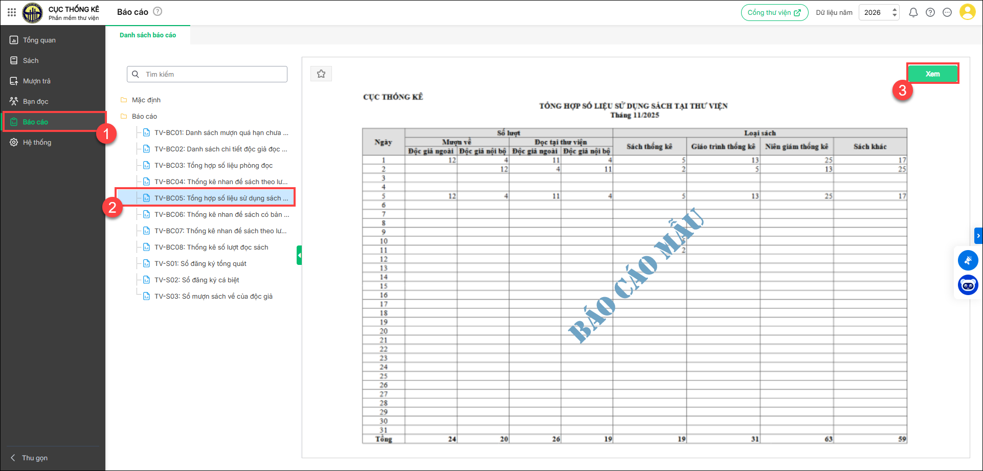 1. Chọn Báo cáo\TV-BC05: Tổng hợp số liệu sử dụng sách tại thư viện. Nhấn Xem