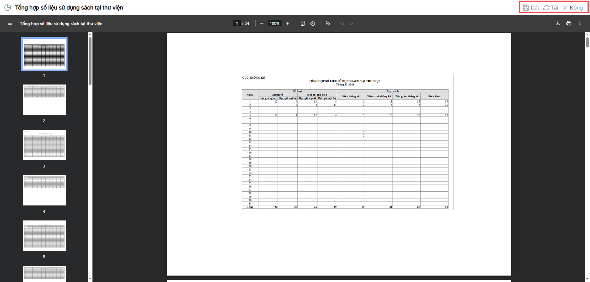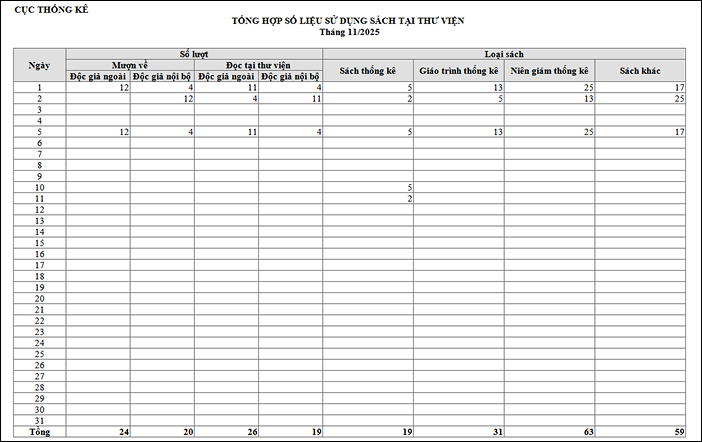 Để in Danh sách tổng hợp số liệu sử dụng sách tại thư viện, CBTV thực hiện như sau: