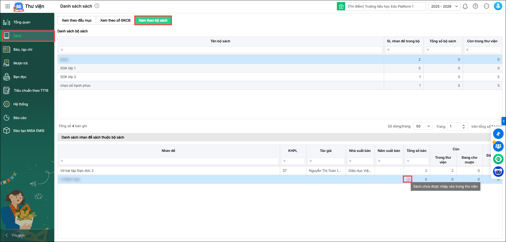 - Tại phần danh sách nhan đề sách thuộc bộ sách, phần mềm bổ sung cảnh báo “Sách chưa được nhập vào trong thư viện” để cán bộ thư viện có thể nắm được và kịp thời bổ sung