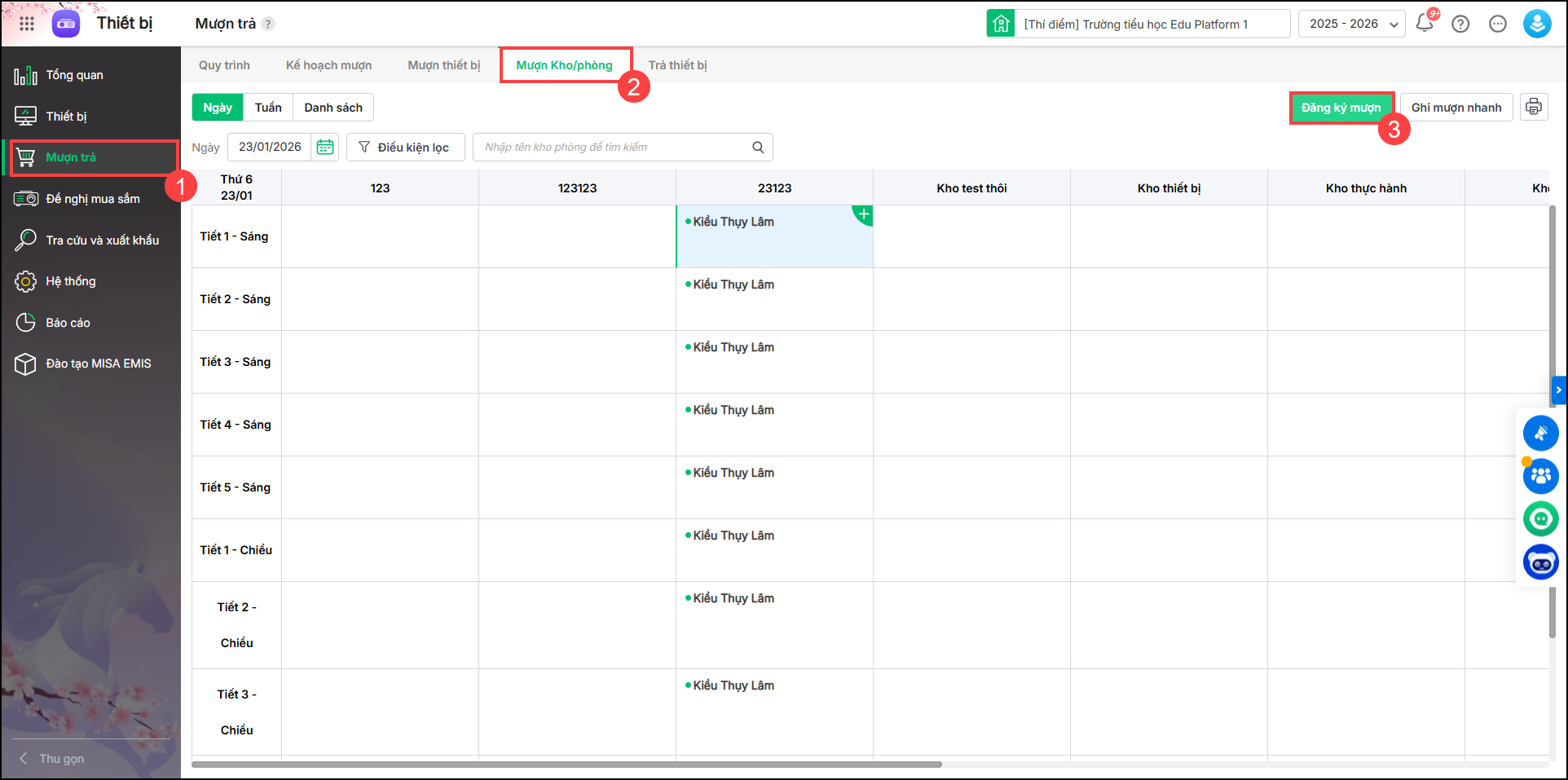 1. Vào Mượn trả/Mượn kho/phòng/Đăng ký mượn