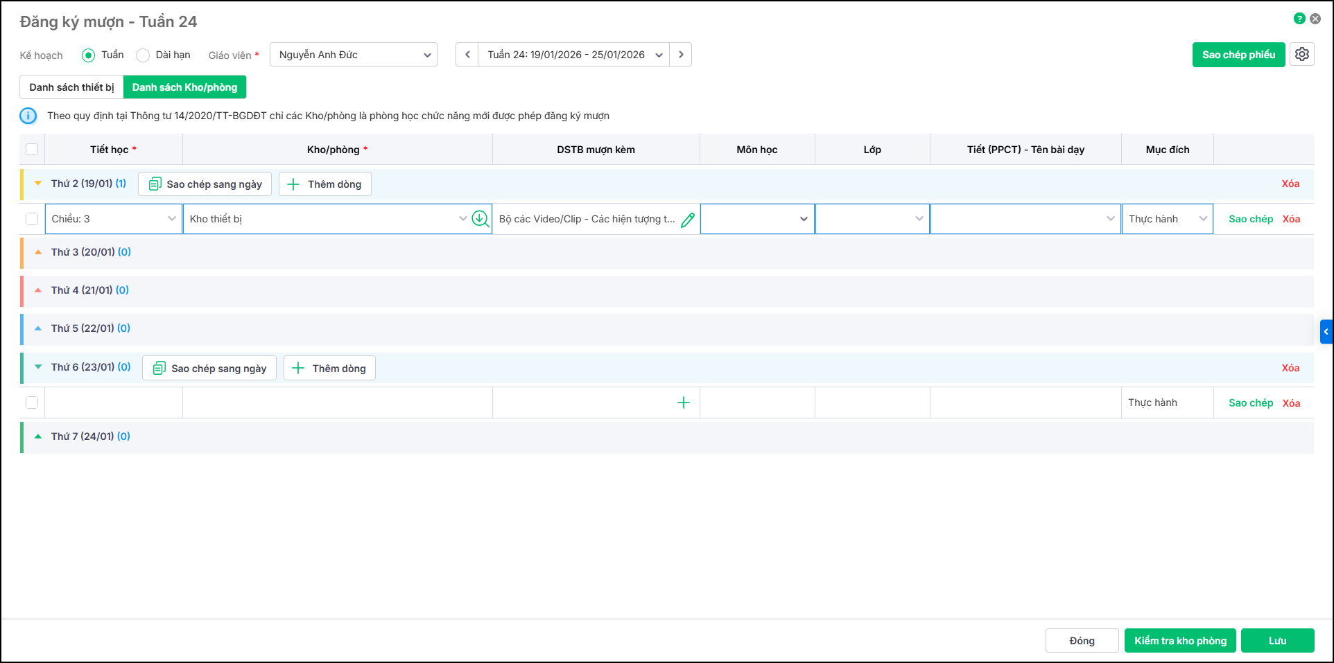 2. Tại mục Danh sách kho phòng, anh/chị khai báo 1 số thông tin: tên giáo viên, tiết học, kho/phòng.