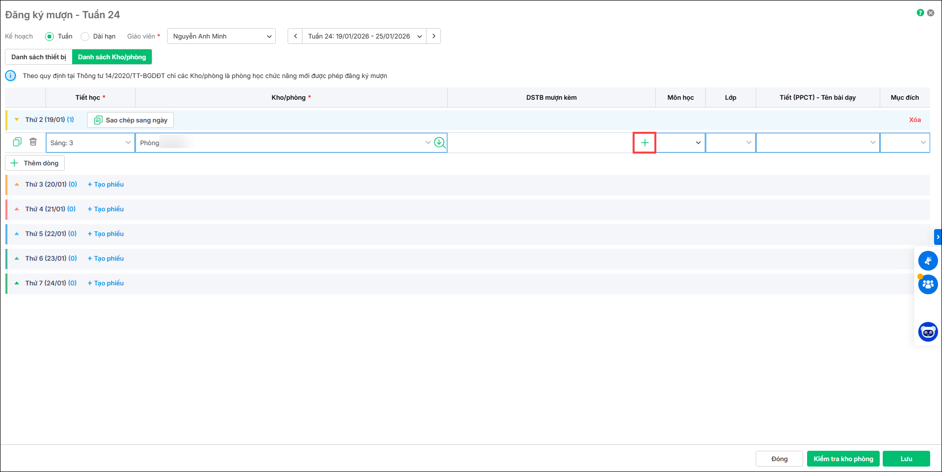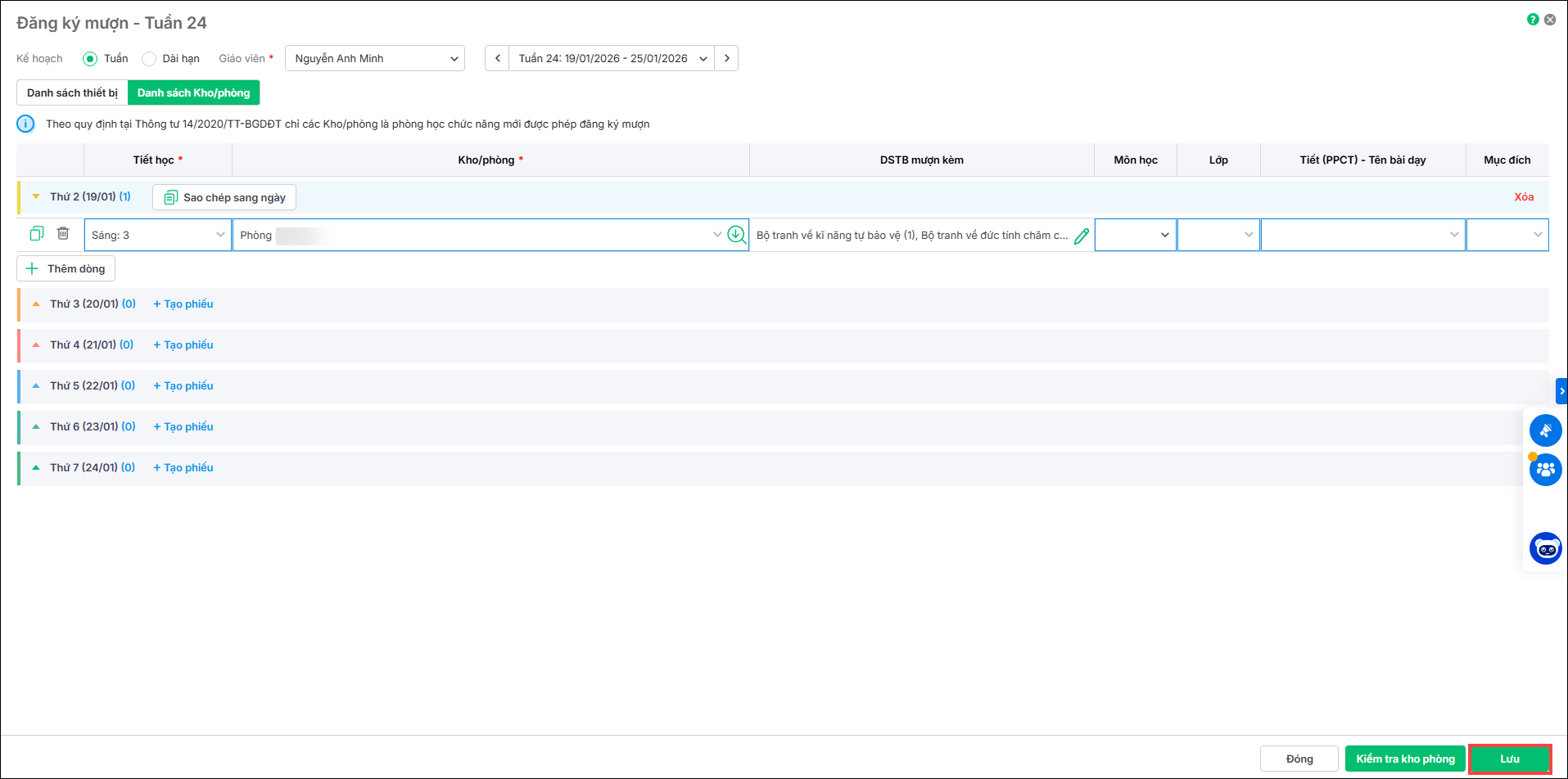 2. Tại mục Danh sách kho phòng, anh/chị khai báo 1 số thông tin: tên giáo viên, tiết học, kho/phòng.