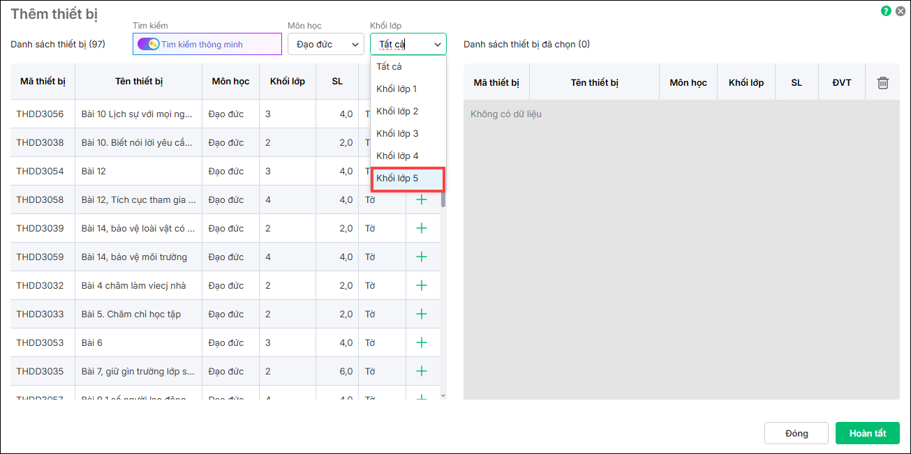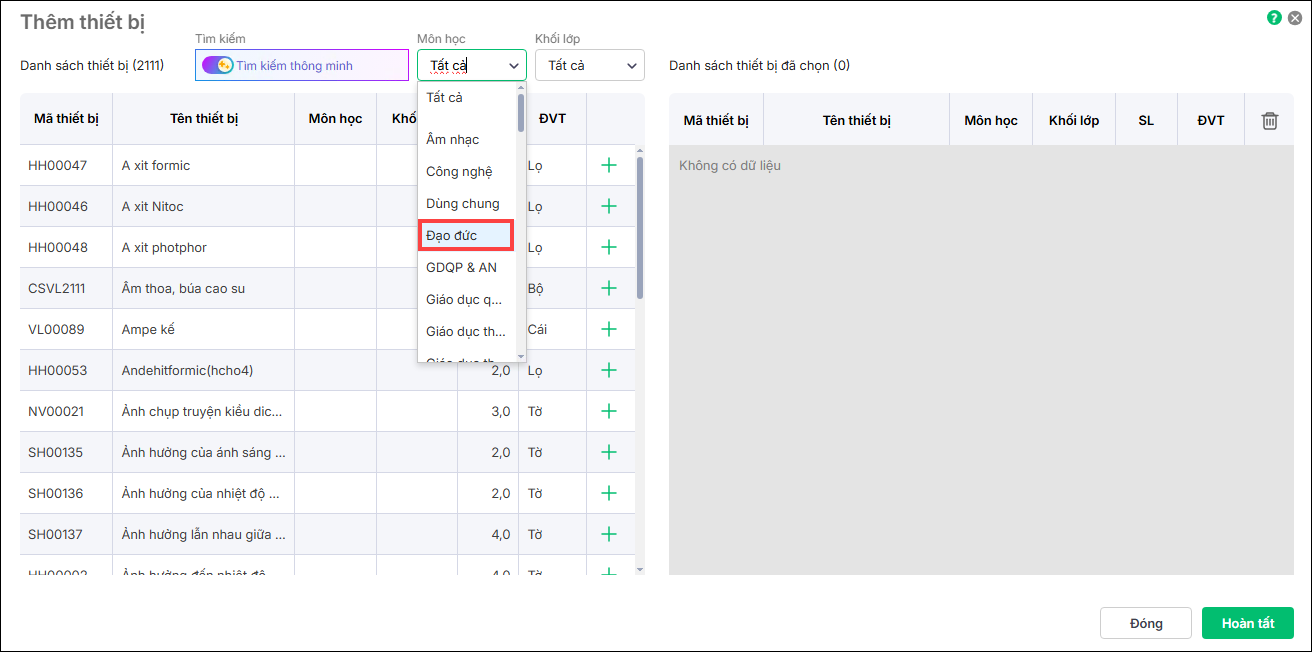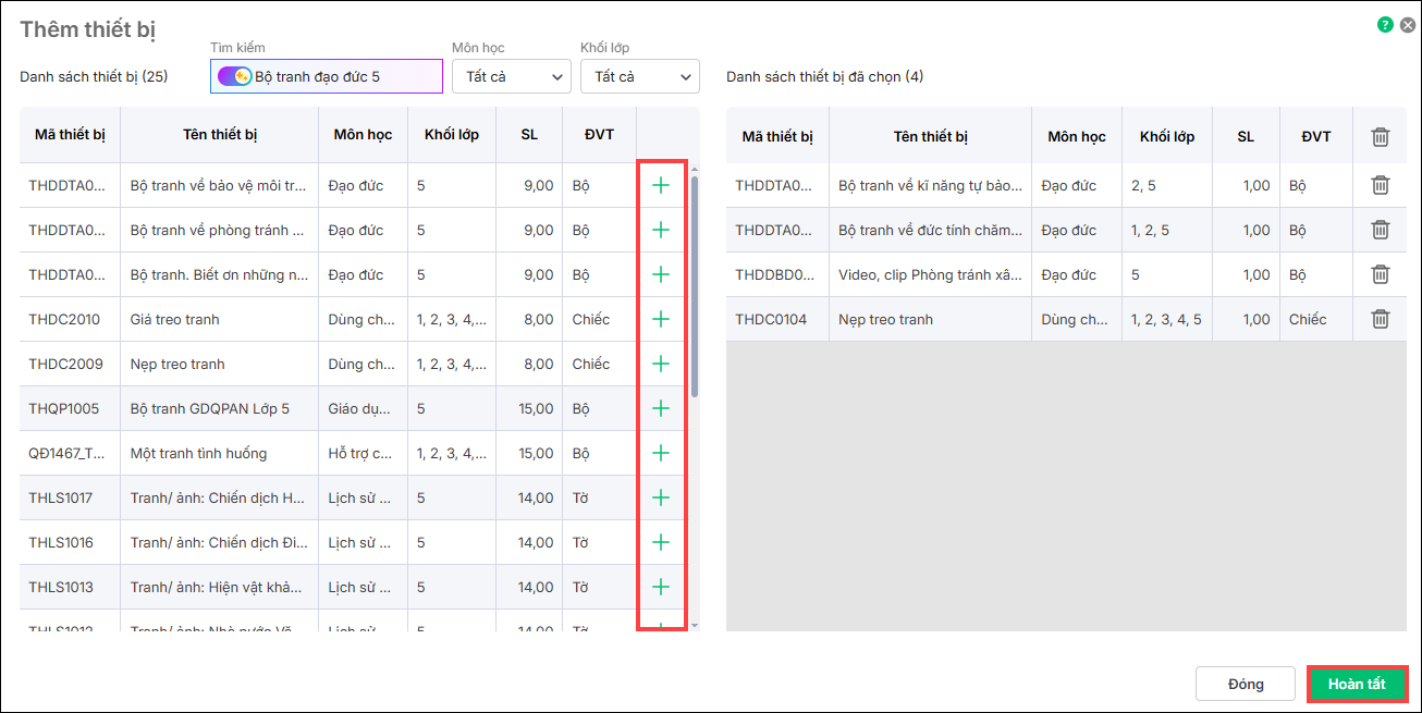 4. Chương trình hiển thị danh sách thiết bị thuộc môn học, khối lớp mà anh/chị vừa chọn. Nhấn dấu  (+) để thêm thiết bị cần mượn. Nhấn Hoàn tất.
