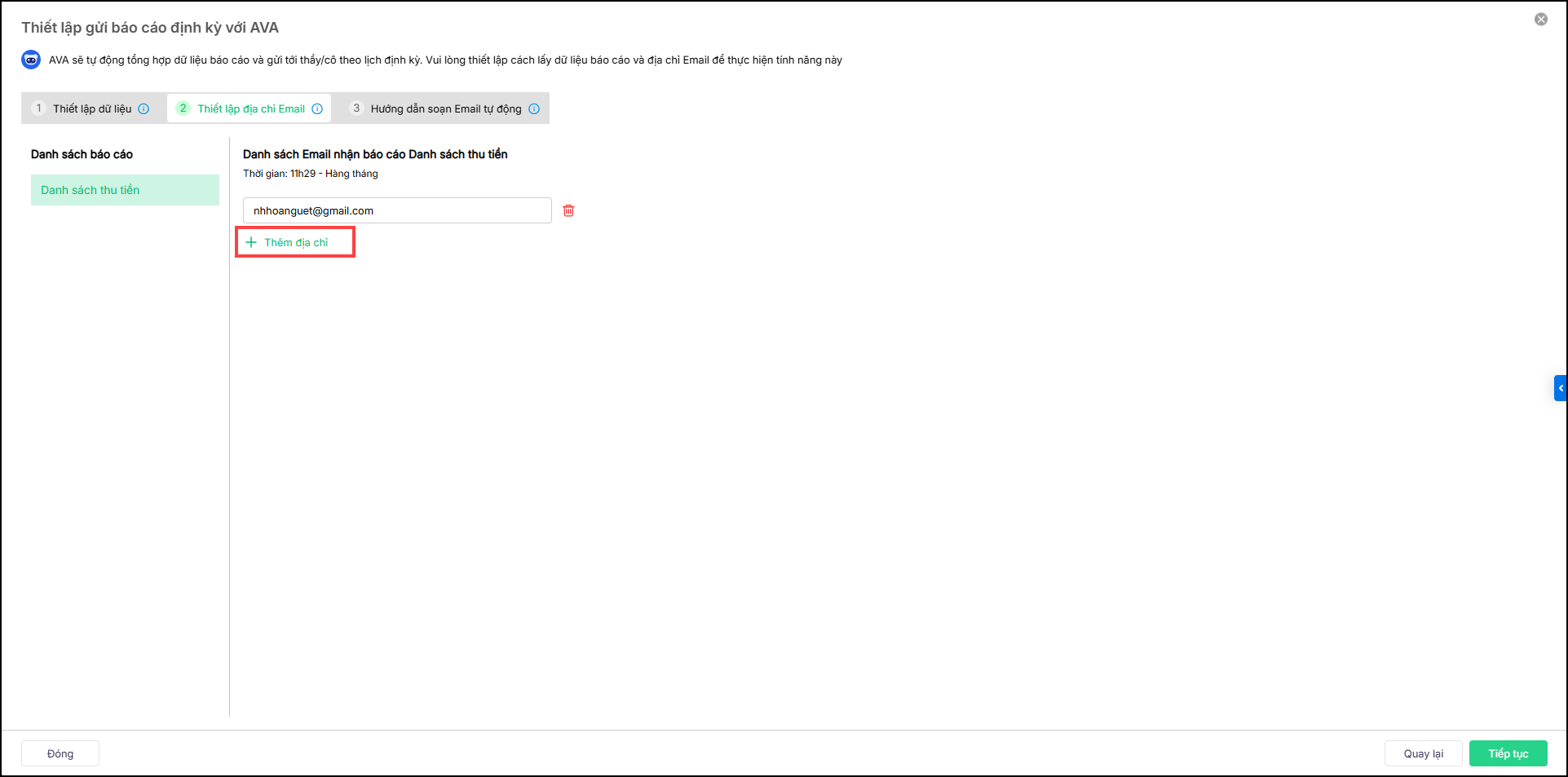 Bước 3: Thiết lập địa chỉ email nhận báo cáo