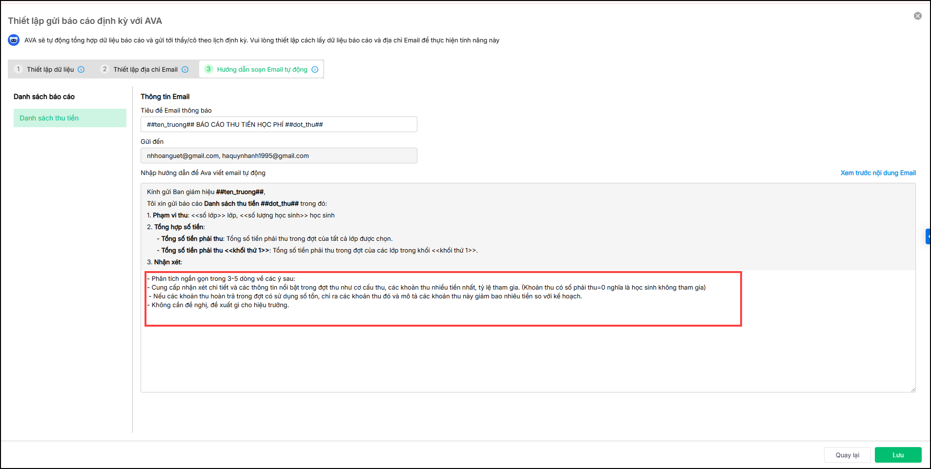 Phần mềm đã soạn sẵn mẫu câu lệnh để trợ lý số AVA viết email tự động. Trong đó có 1 số thông tin mặc định không thể sửa như: Phạm vi thu; Tổng hợp số tiền.