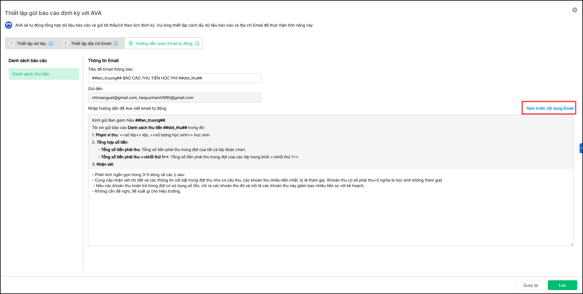 2. Nhấn Xem trước nội dung email để xem nội dung email AVA đã soạn trước khi gửi báo cáo tự động