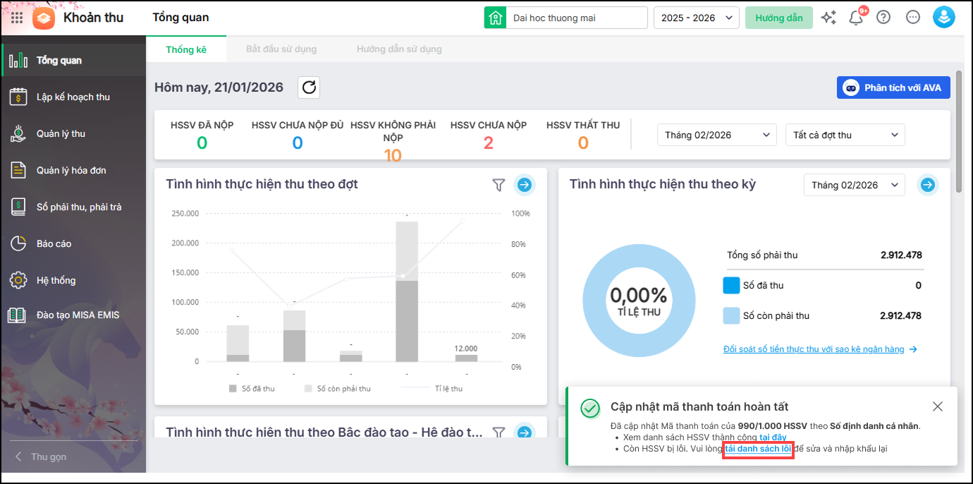 Bài viết hướng dẫn kế toán cập nhật mã thanh toán của học sinh, sinh viên theo mã định danh trên các báo cáo thu tiền để dễ dàng đối chiếu với file đối soát và thuận tiện cho công tác truyền thông tới học sinh, sinh viên về việc thanh toán.