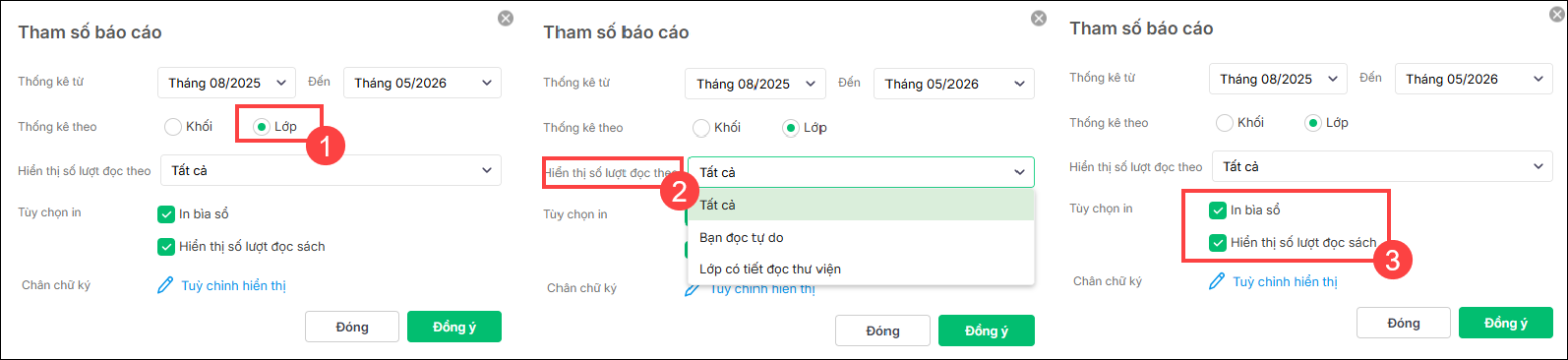 + Bạn đọc tự do: Báo cáo sẽ lấy lên số lượt đọc của học sinh tự do thống kê theo lớp