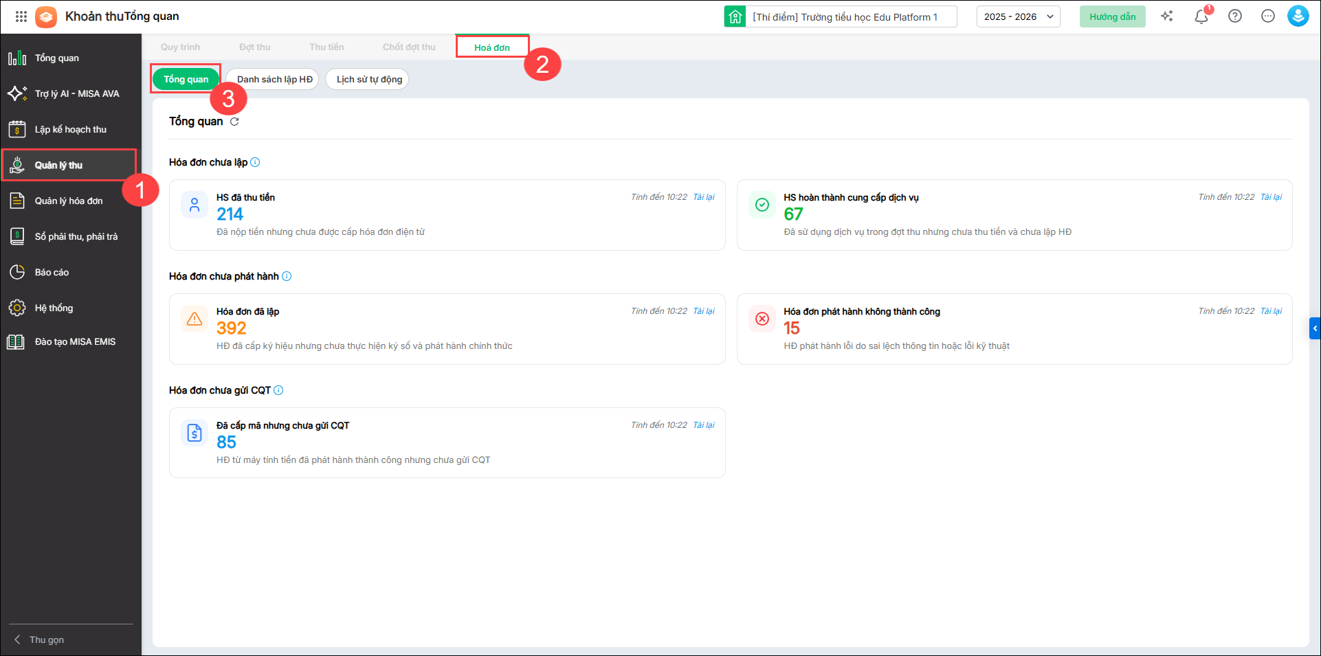 - Vào Quản lý thu/Hóa đơn/Tổng quan