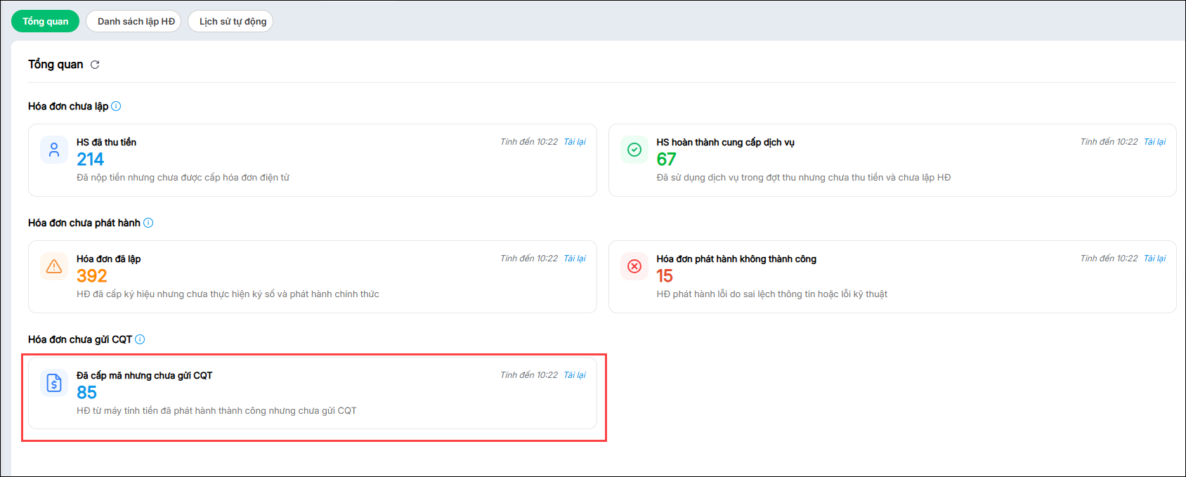- Hóa đơn chưa gửi Cơ quan thuế: Hóa đơn từ máy tính tiền đã phát hành nhưng chưa gửi tới cơ quan thuế