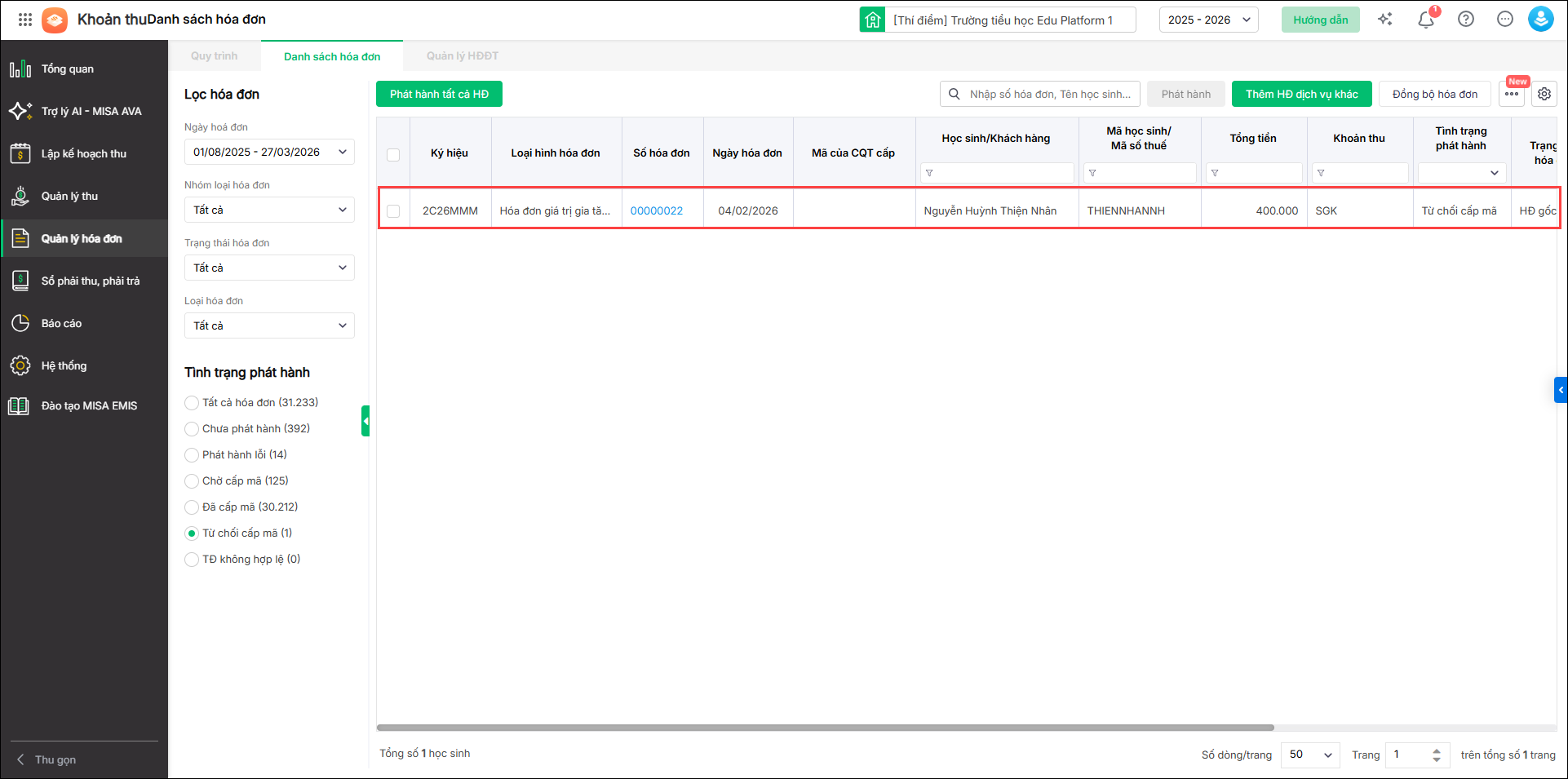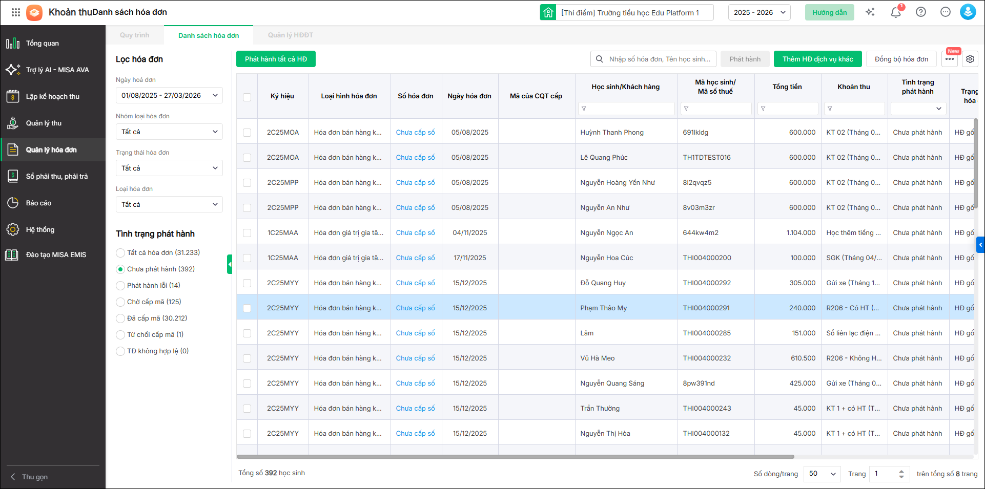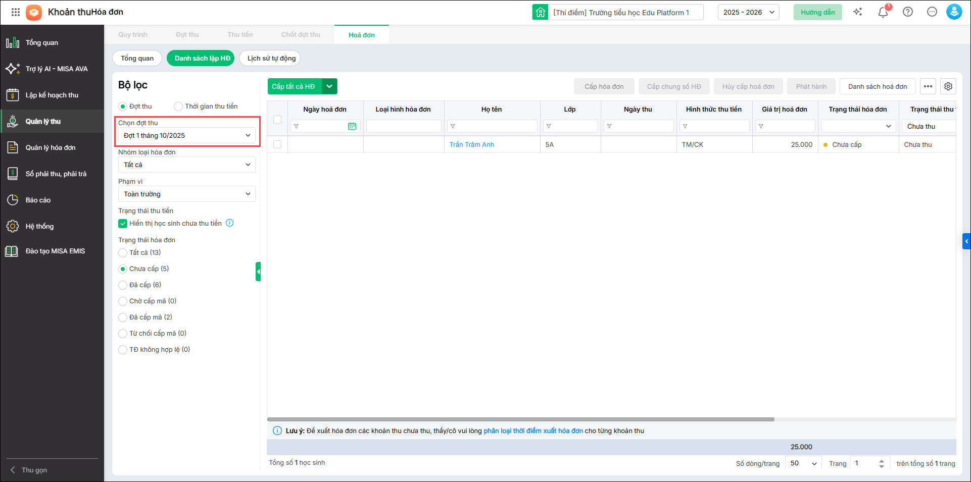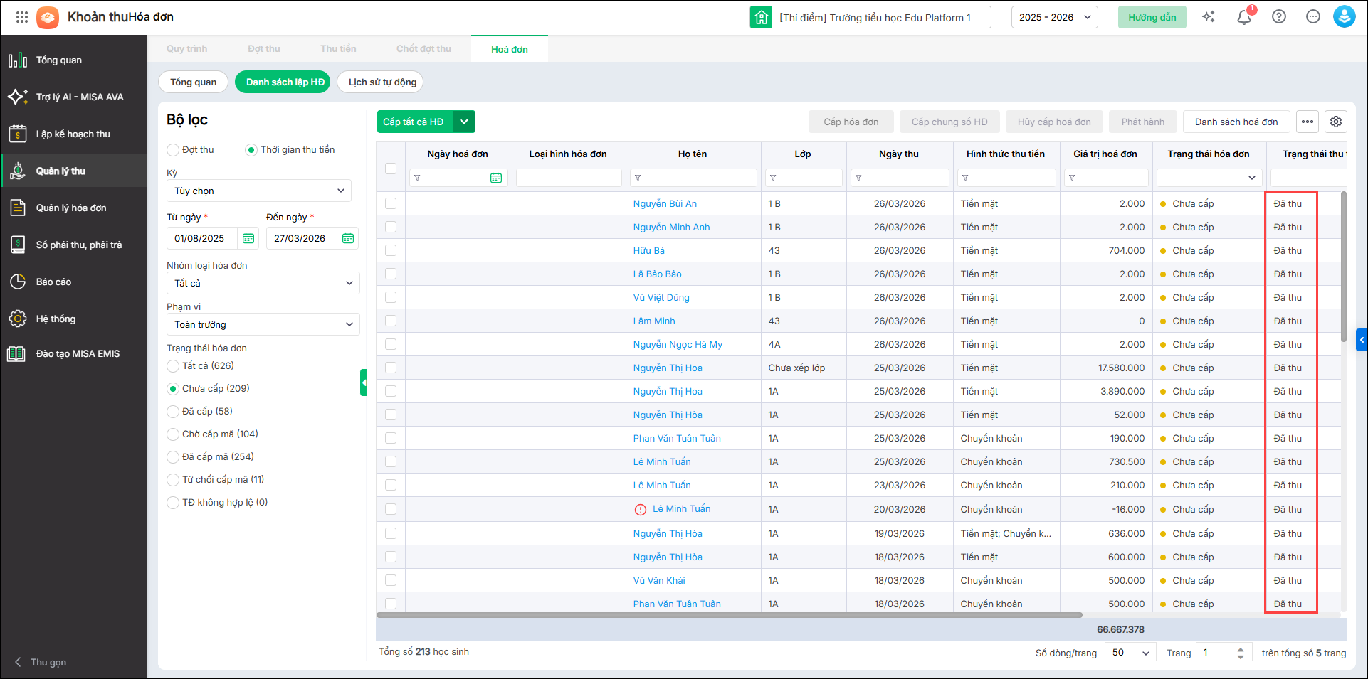 - HS đã thu tiền: Chương trình thống kê số học sinh đã thu tiền nhưng chưa được cấp hóa đơn điện tử.