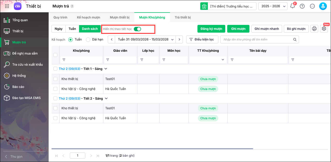 - Vào Mượn trả/Mượn kho phòng. Bật tùy chọn Hiển thị theo tiết học