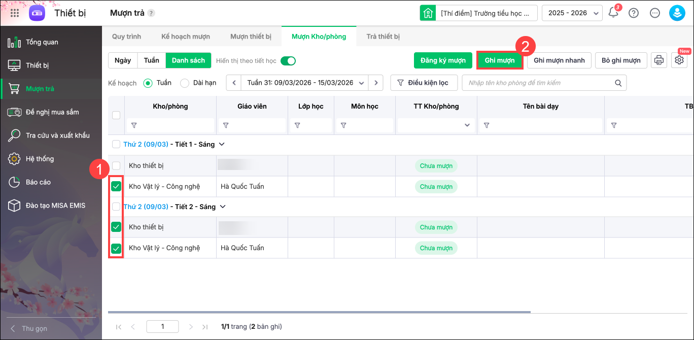 2. Chương trình hiển thị danh sách mượn kho/phòng trong cùng tiết học. Anh/chị tích chọn phiếu mượn sau đó nhấn Ghi mượn