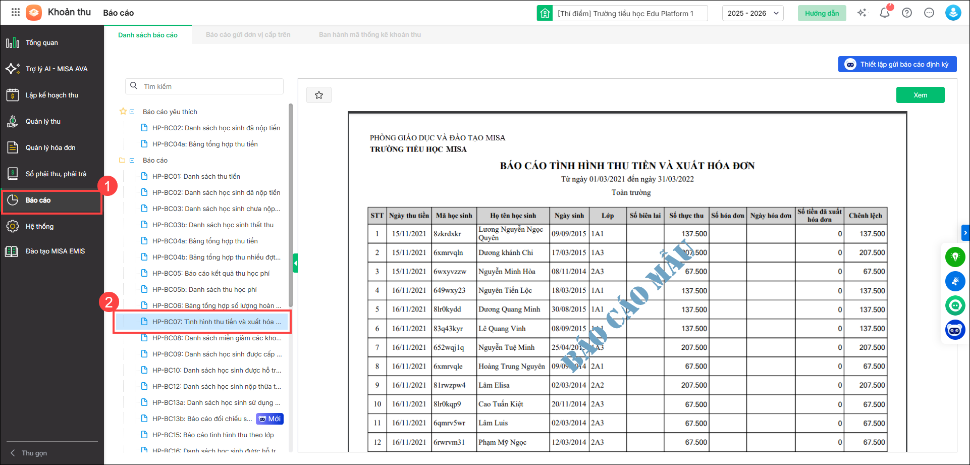 5. [EMIS Khoản thu] Hướng dẫn kế toán thống kê số tiền trên hóa đơn và thông tin thu tiền tương ứng
