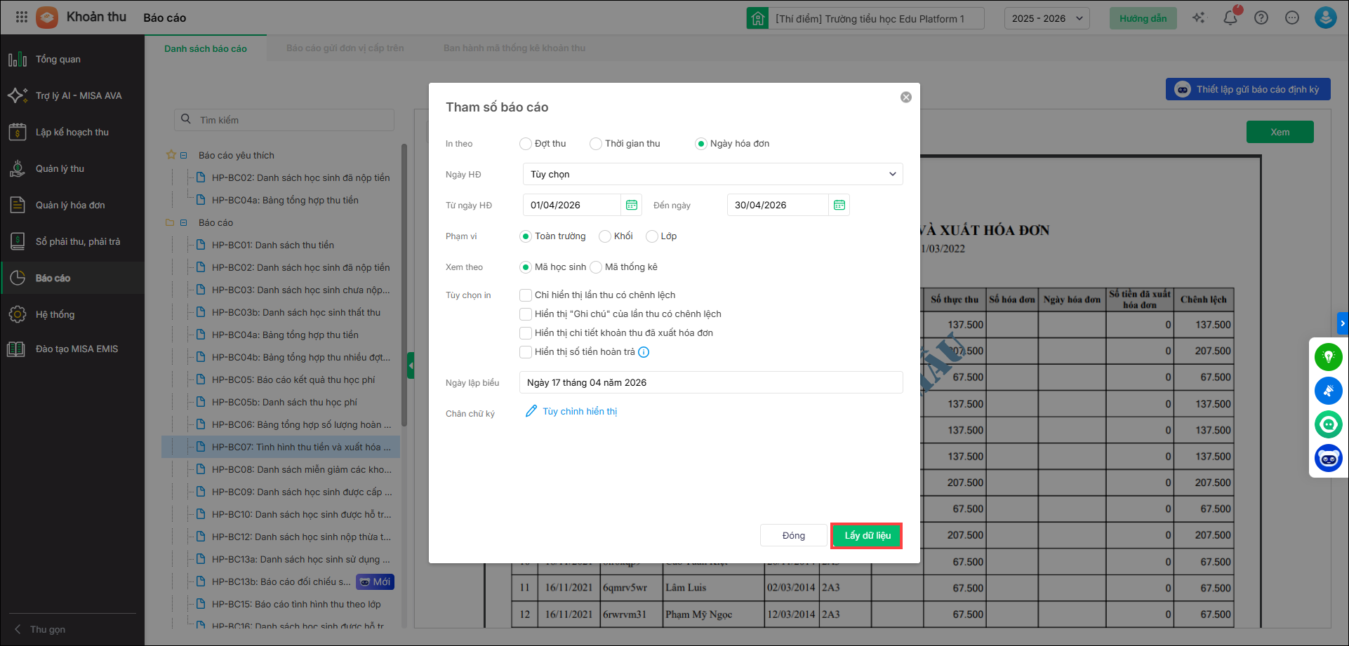 2. Tại phần tham số báo cáo, tích chọn in theo Ngày hóa đơn. Chương trình sẽ chỉ lấy lên các học sinh đã phát hành hóa đơn. Sau đó nhấn Lấy dữ liệu