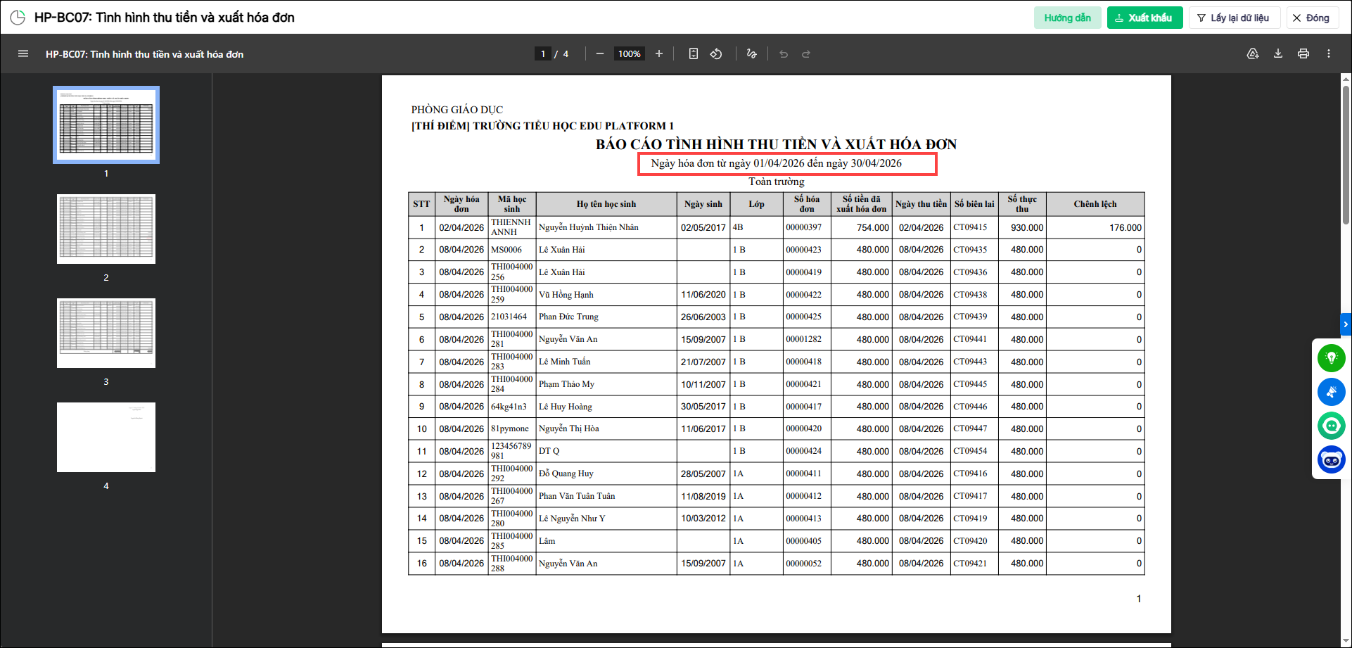 Đầu tháng kế toán lập đợt thu để thu các khoản thu theo kế hoạch. Khi nhận được tiền từ phụ huynh, kế toán xuất hóa đơn theo đúng thời điểm quy định của cơ quan thuế. Đến cuối tháng kế toán thực hiện đối soát 1 – 1 giữa danh sách các hóa đơn đã phát hành và các giao dịch thu tiền thực tế để đảm bảo mọi khoản doanh thu có dòng tiền tương ứng.