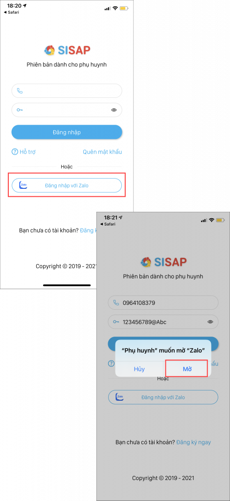 (Xem hướng dẫn tại đây) - Anh/chị thực hiện đăng nhập vào SISAP thông qua tài khoản Zalo bằng cách nhấn Đăng nhập với Zalo. Chọn Mở.