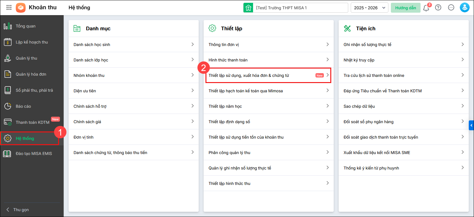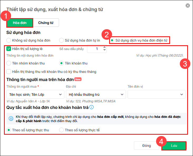 - Thiết lập Thông tin nội dung khoản thu trên hóa đơn: