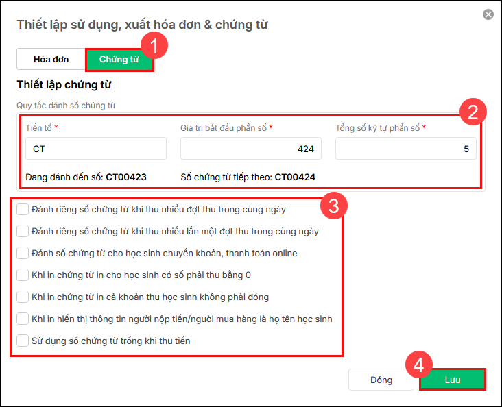 - Tích chọn Đánh số chứng từ cho học sinh chuyển khoản để đánh số chứng từ cho cả học sinh nộp tiền học theo hình thức chuyển khoản