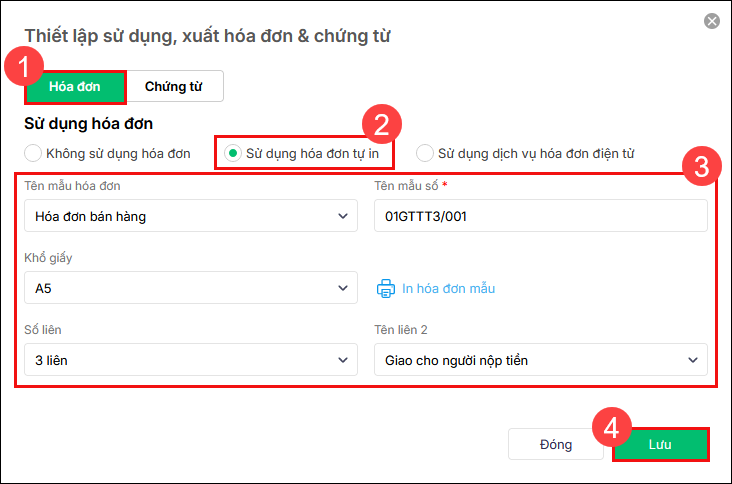 3. Nếu đơn vị sử dụng hoá đơn tự in thì tích chọn Sử dụng hoá đơn tự in.