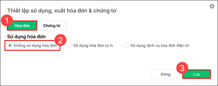 2. Nếu đơn vị không sử dụng hoá đơn, tích chọn Không sử dụng hoá đơn. Nhấn Lưu.