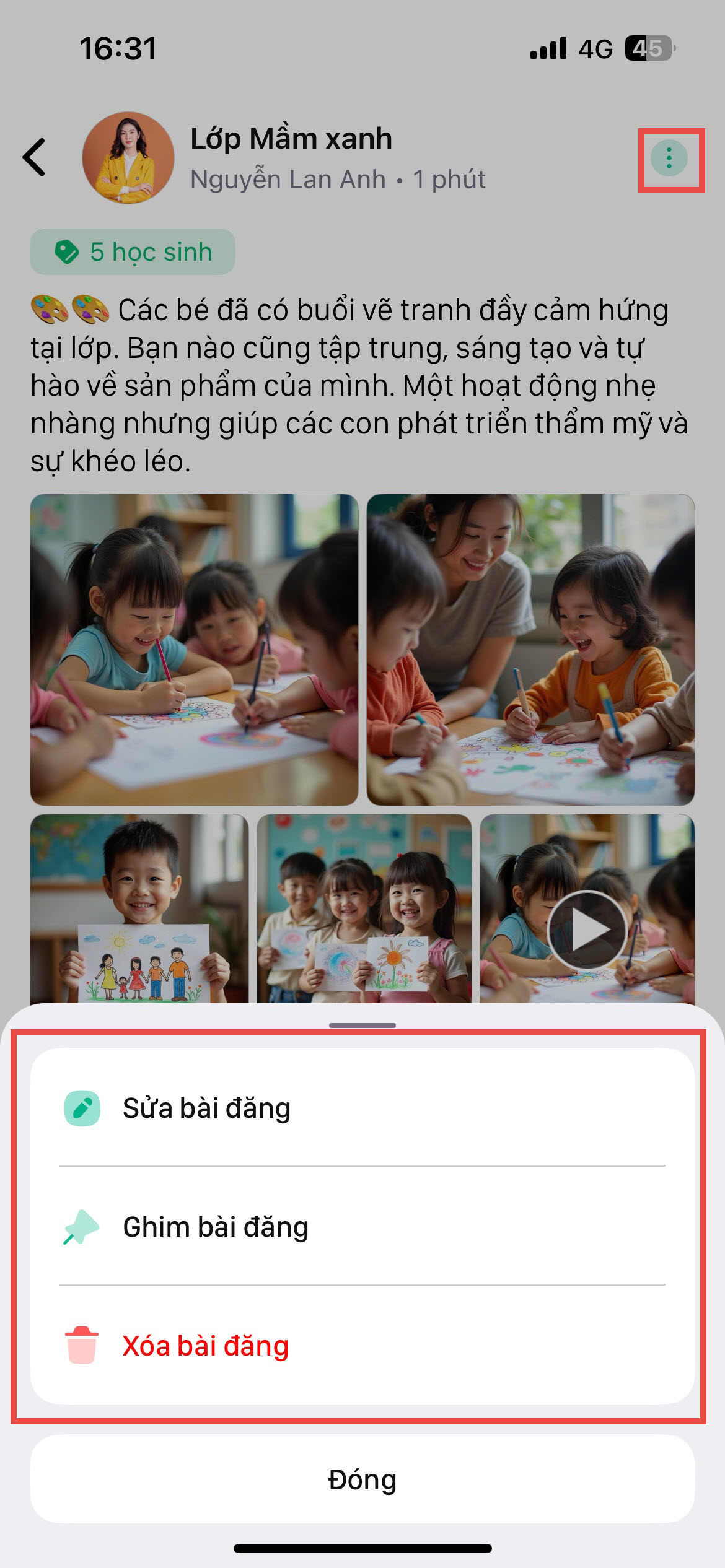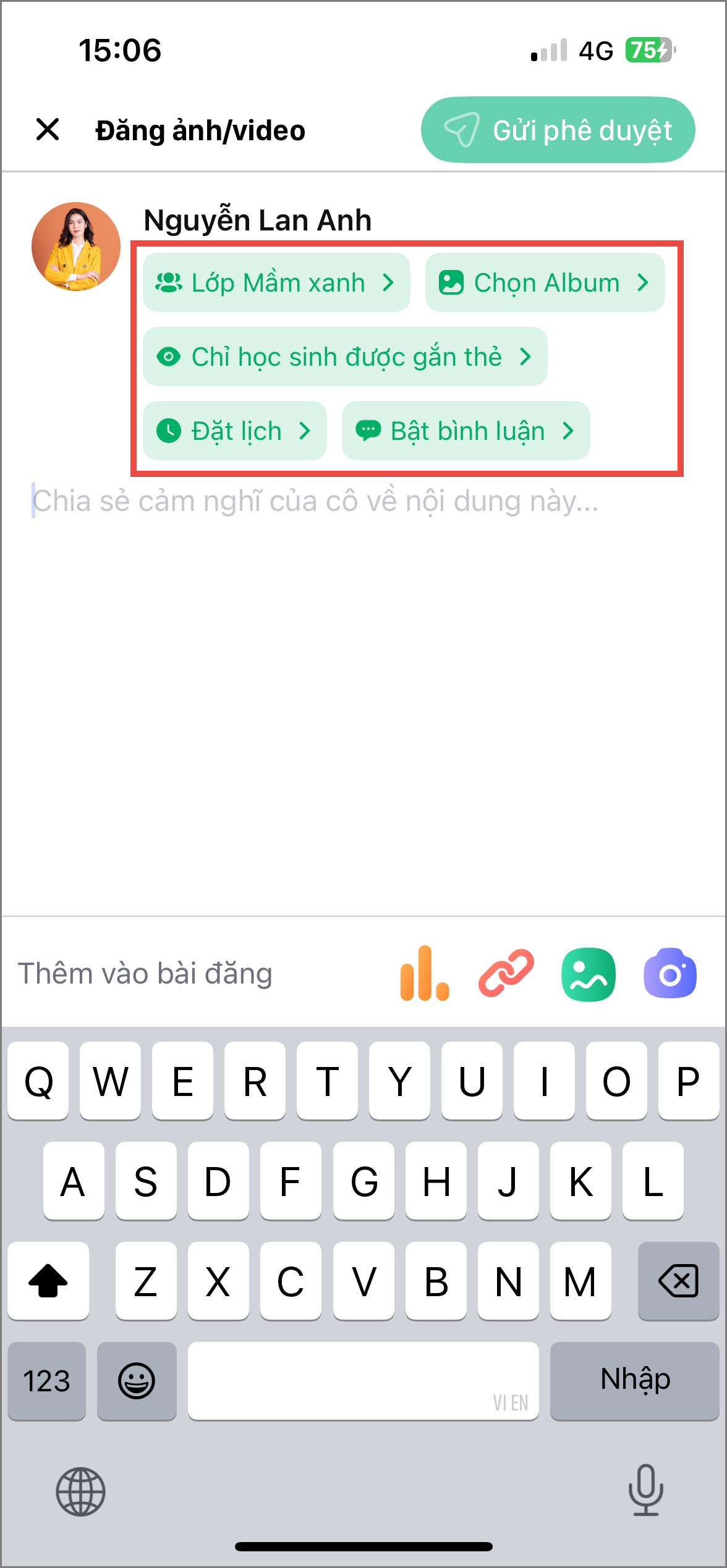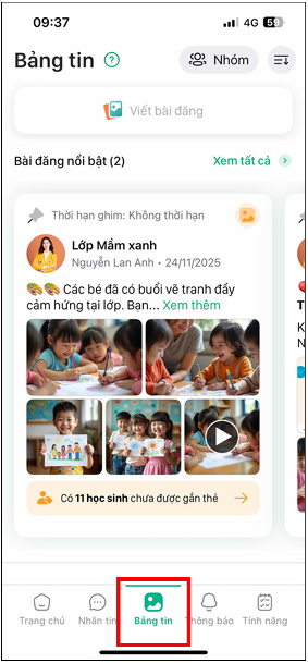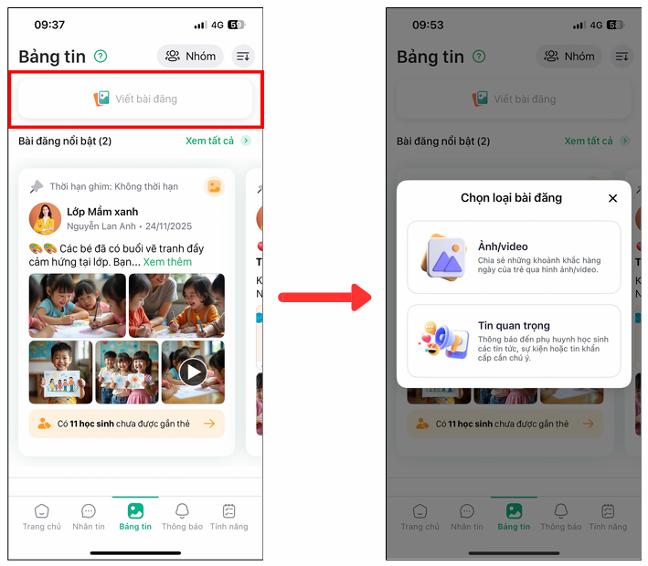 Mục tiêu: Giúp Anh/Chị tạo một bài đăng mới để chia sẻ thông tin hoặc hình ảnh hoạt động của lớp đến phụ huynh một cách nhanh chóng.
