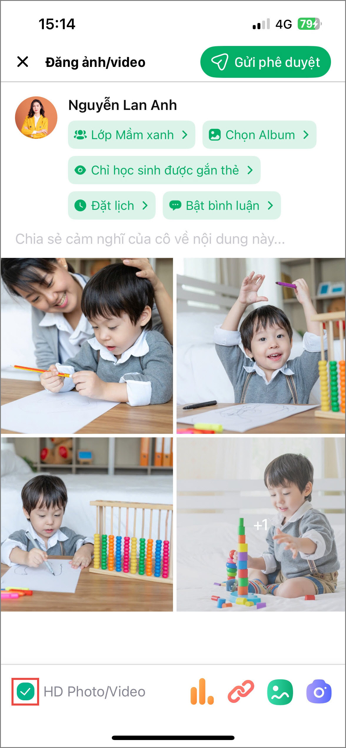 - Gắn thẻ (tag) học sinh vào ảnh để phụ huynh dễ dàng theo dõi.