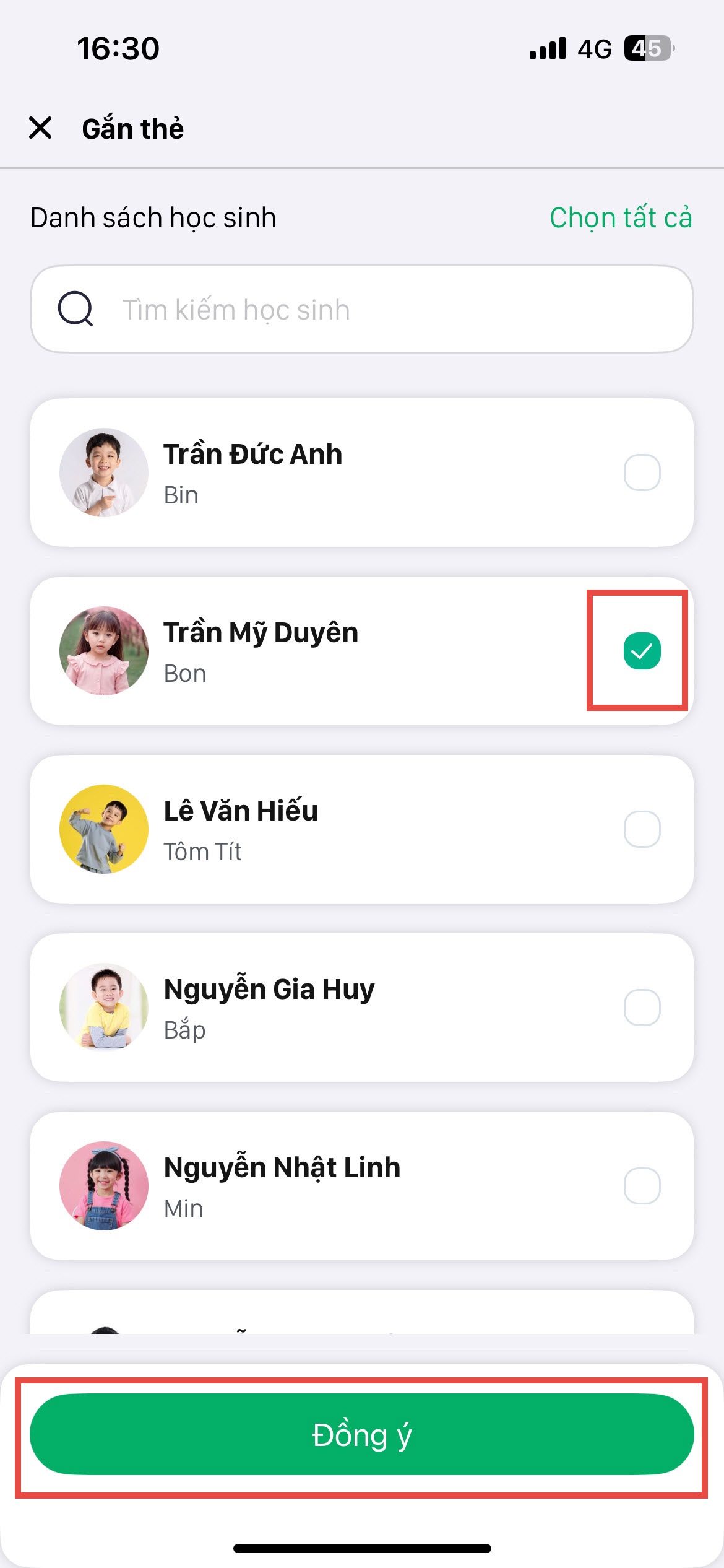 Lưu ý: Sau khi hoàn tất, Anh/Chị có thể nhấn vào dòng hiển thị số lượng học sinh đã được gắn thẻ để kiểm tra lại danh sách chi tiết.