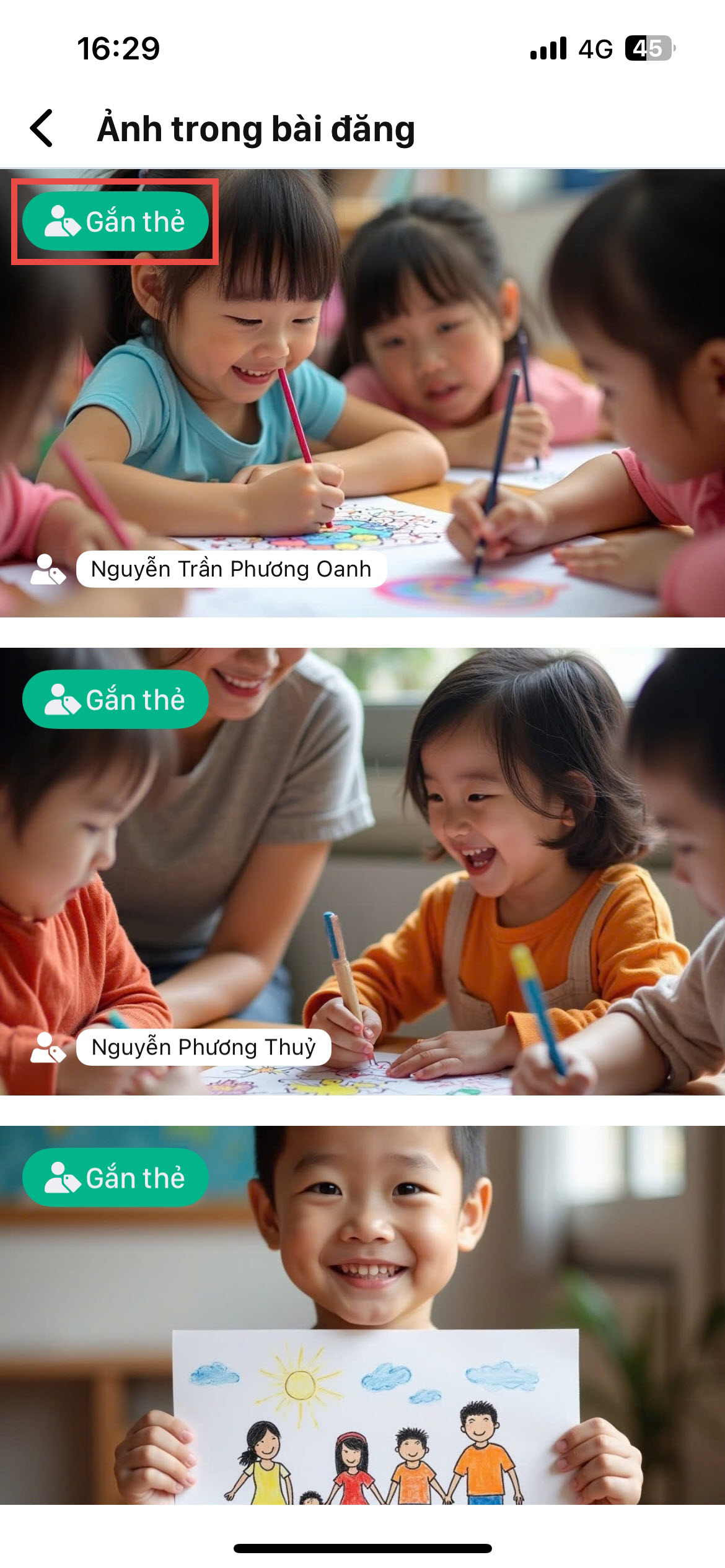 - Hệ thống sẽ hiển thị danh sách Ảnh trong bài đăng và Học sinh chưa được gắn thẻ.