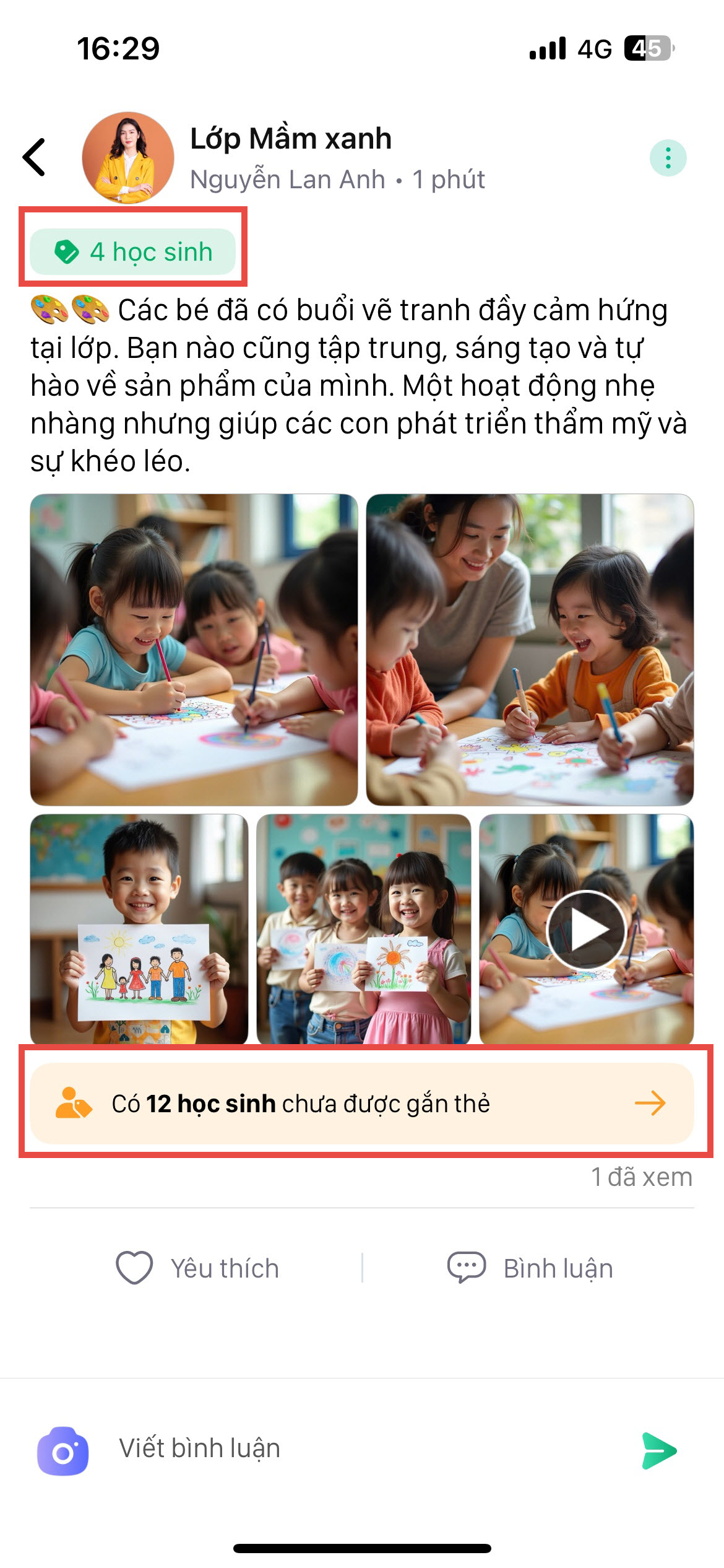 - Sau khi đăng bài, nếu có học sinh chưa được gắn thẻ, hệ thống sẽ hiển thị cảnh báo: “Có… học sinh chưa được gắn thẻ”.