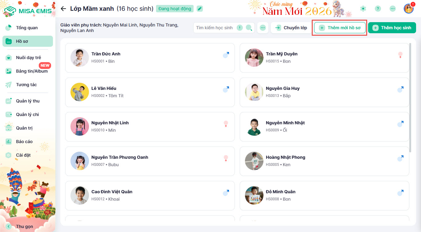 - Thêm mới hồ sơ hoặc thêm học sinh có sẵn vào lớp.