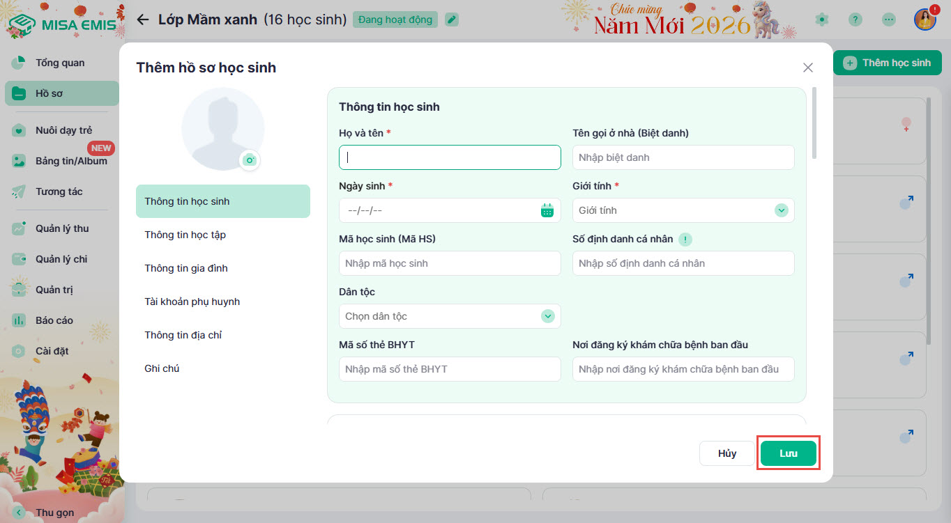 - Nhập đầy đủ thông tin học sinh, thông tin học tập, gia đình, tài khoản phụ huynh, v.v.