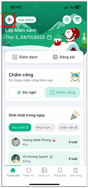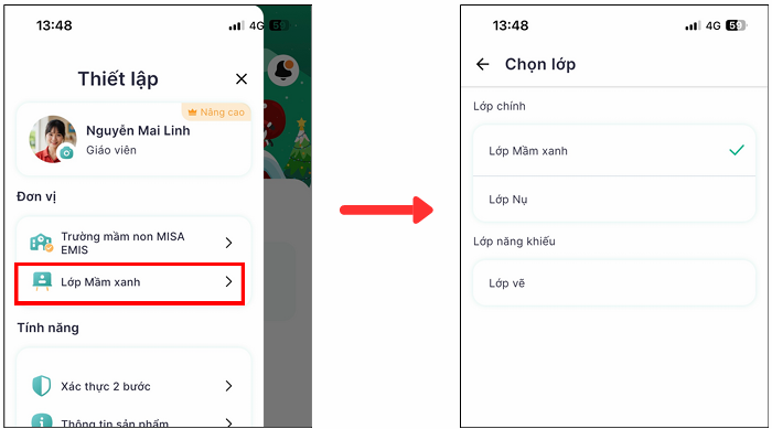 - Màn hình hiển thị danh sách lớp Anh/Chị phụ trách (gồm lớp chính và lớp năng khiếu). Chọn lớp muốn chuyển sang để bắt đầu thao tác.
