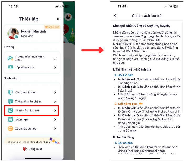 Mục tiêu: Nắm rõ giới hạn dung lượng và thời gian lưu trữ ảnh, video trên ứng dụng để sử dụng phù hợp.