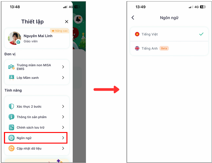 Mục tiêu: Đổi ngôn ngữ hiển thị để sử dụng ứng dụng thuận tiện hơn.